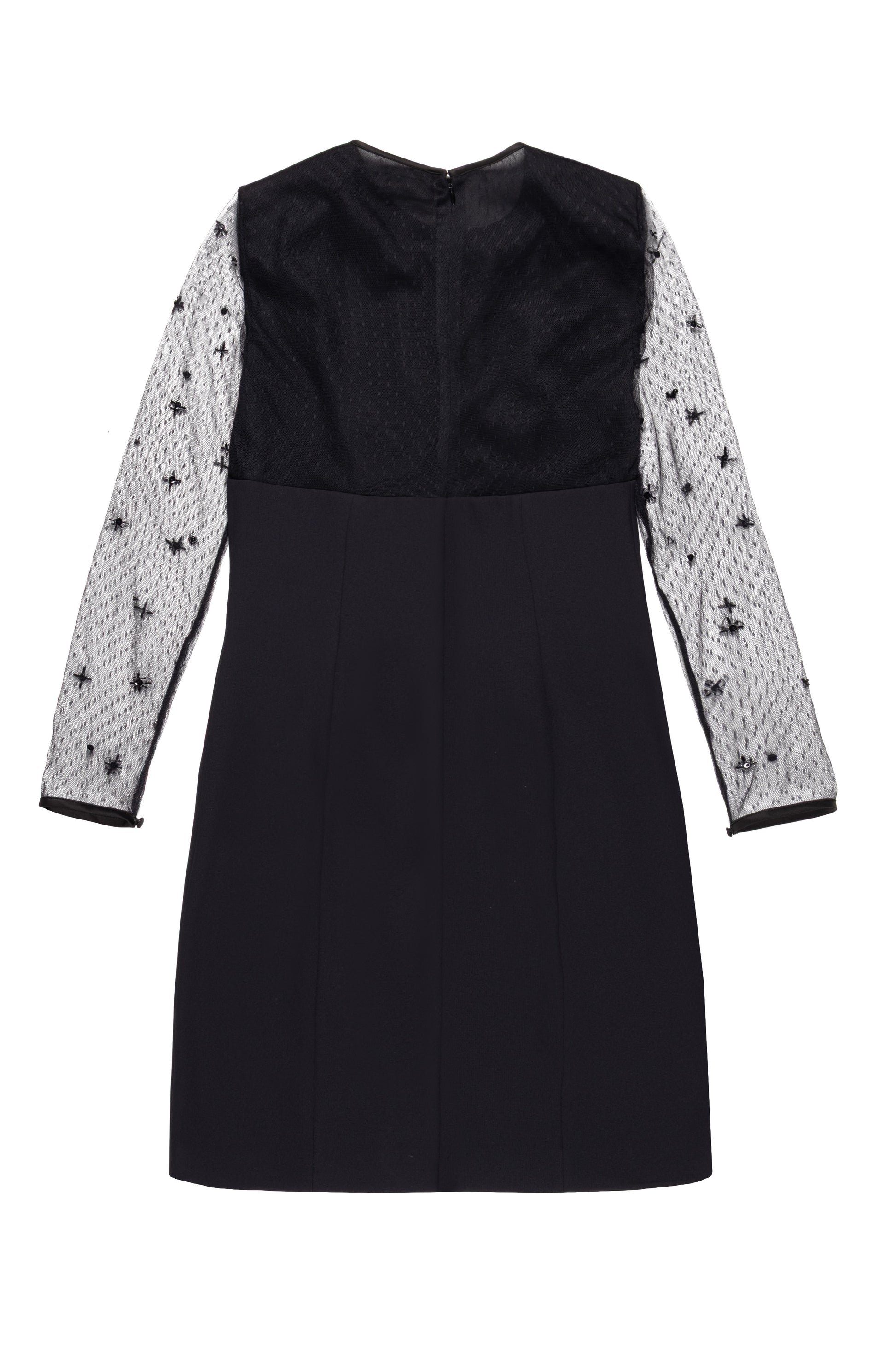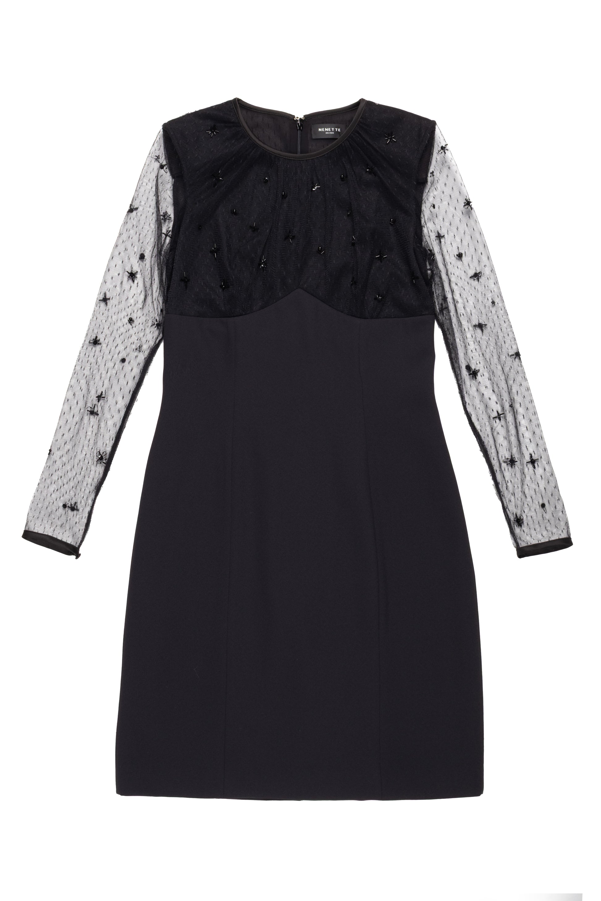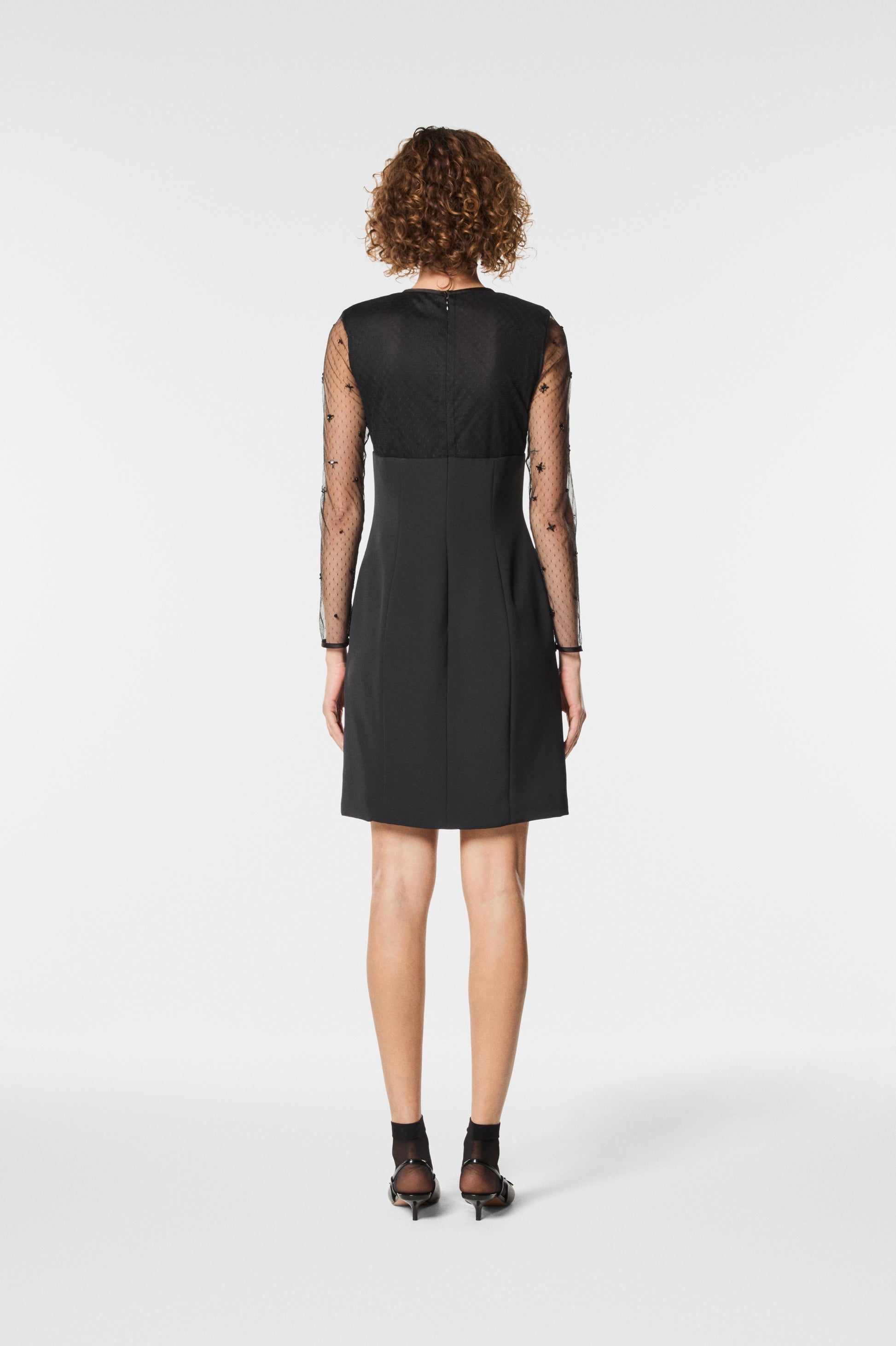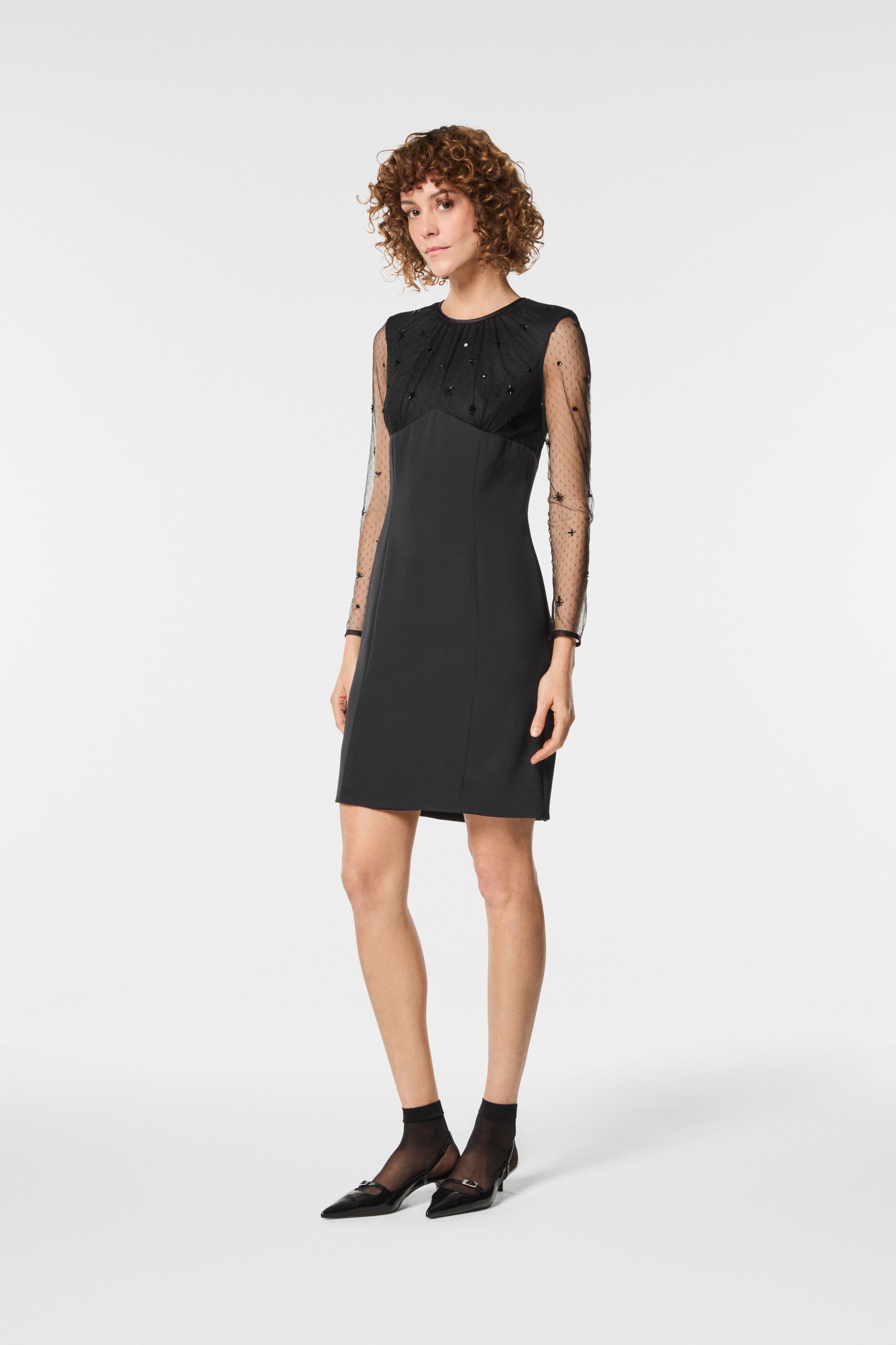 Abito corto elegante con maniche in tulle plumetis e applicazioni strass. Corpino strutturato e dettagli arricciati sul décolleté per un effetto raffinato e femminile. Perfetto per serate speciali o eventi, unisce sobrietà e luce in un equilibrio sofisticato.