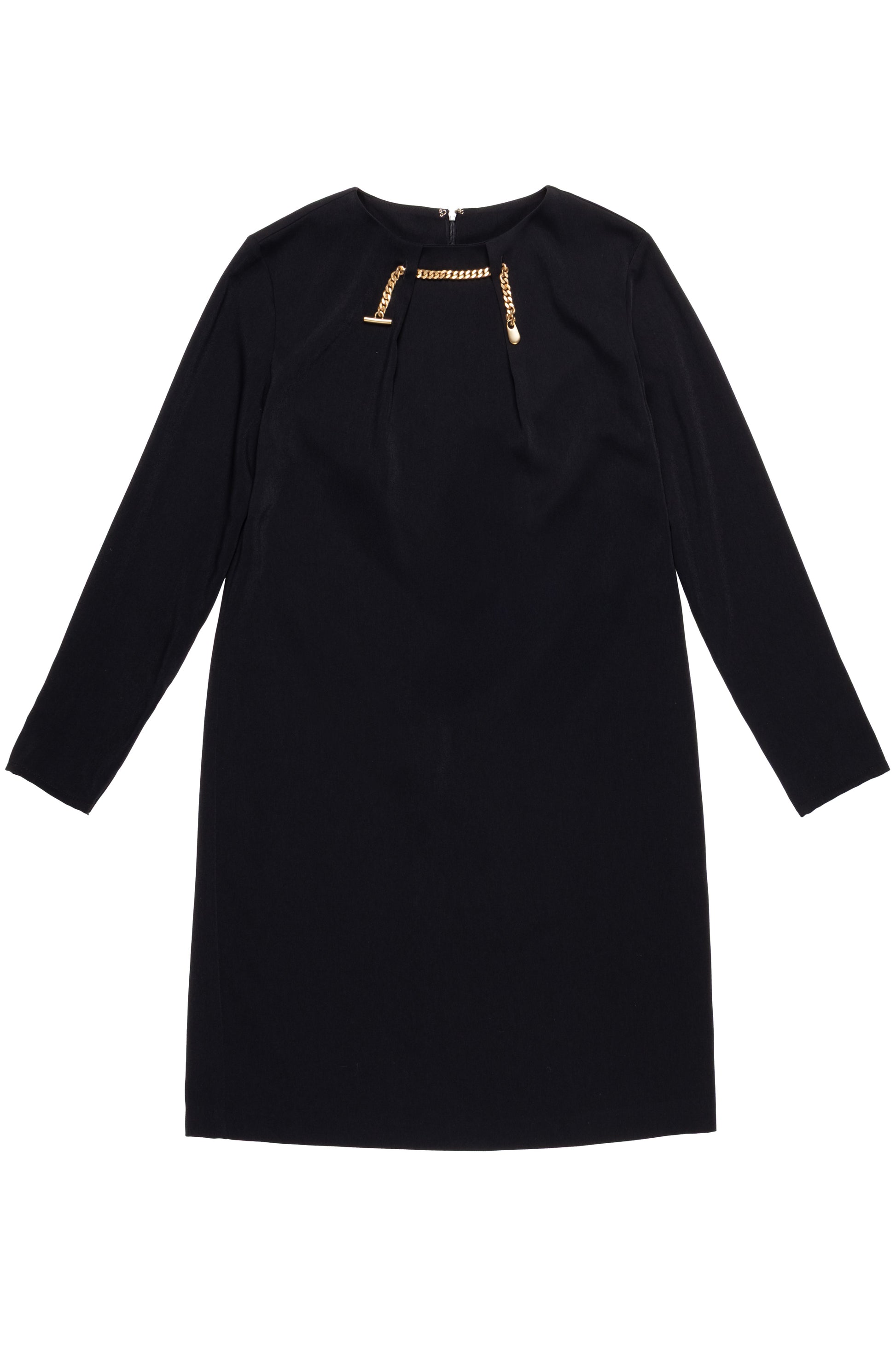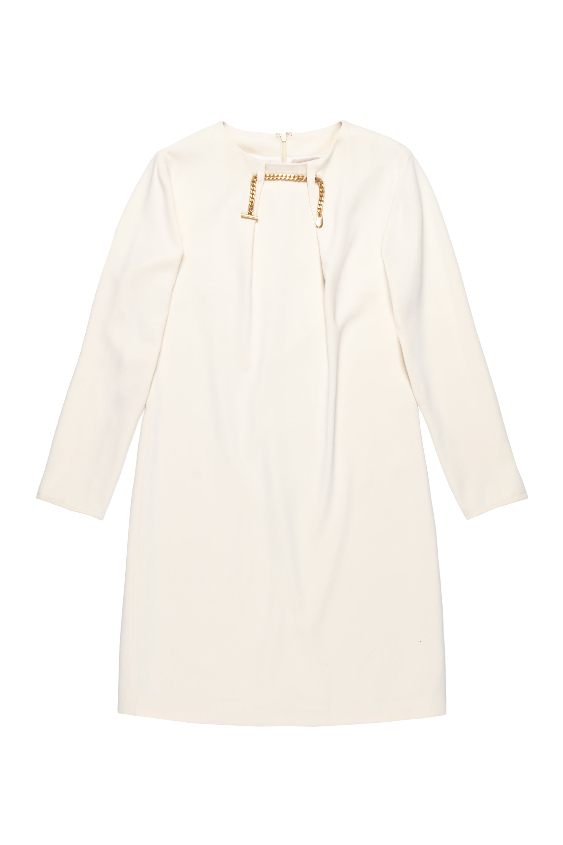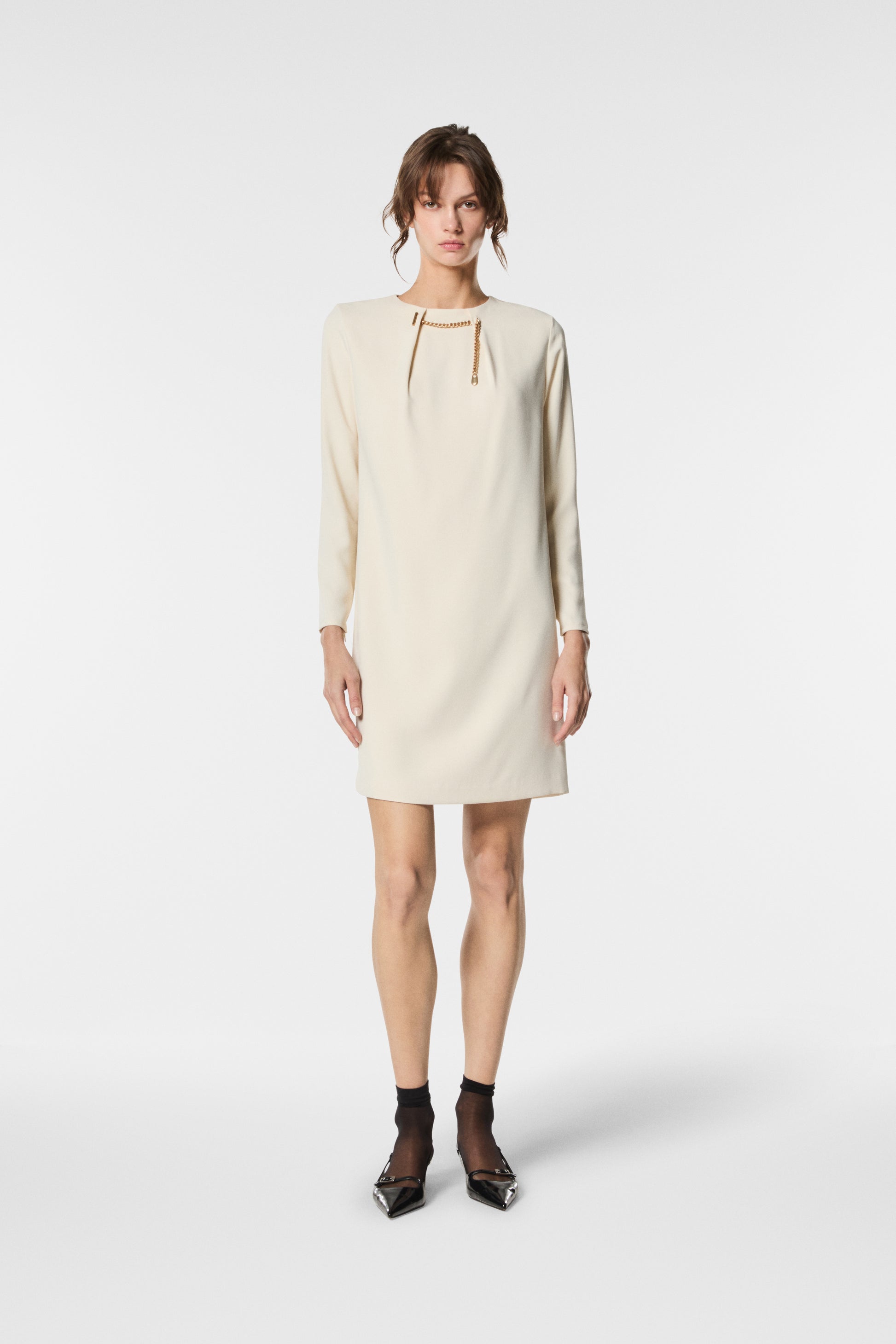 Abito corto con maniche lunghe e girocollo, impreziosito da un elegante dettaglio in catena dorata che illumina il design essenziale. Un modello dal carattere sofisticato e contemporaneo, perfetto per un look casual-chic che non passa inosservato.