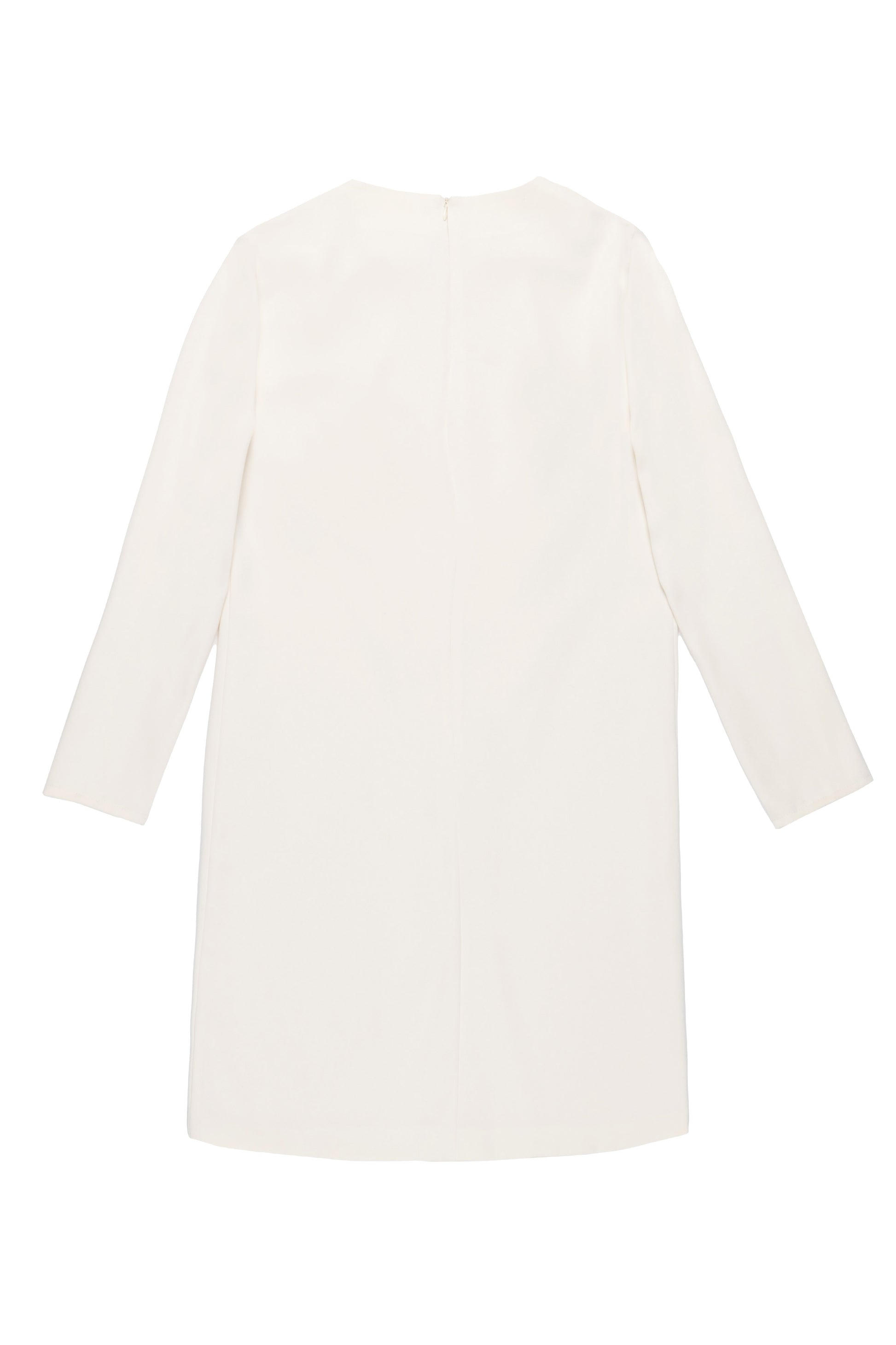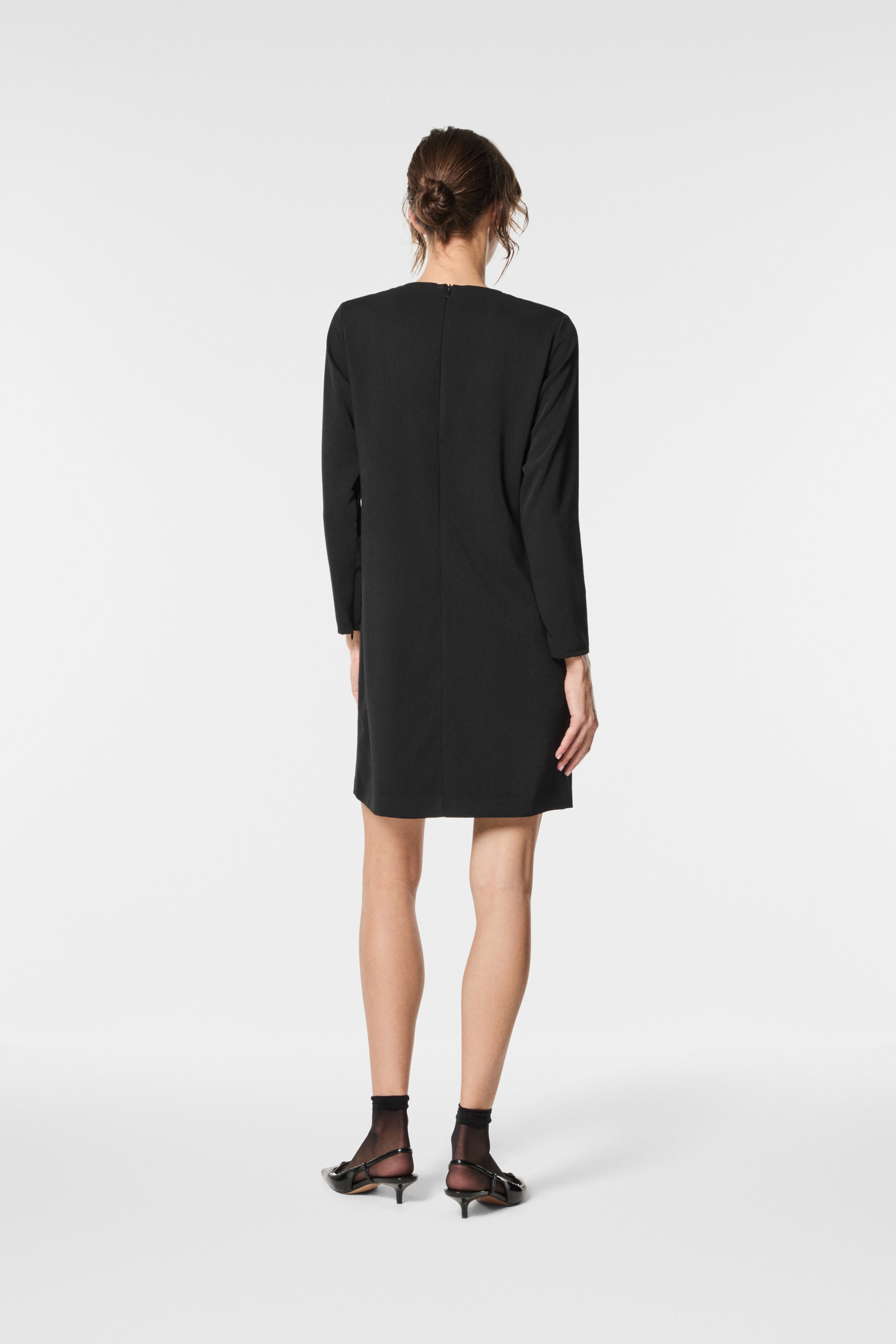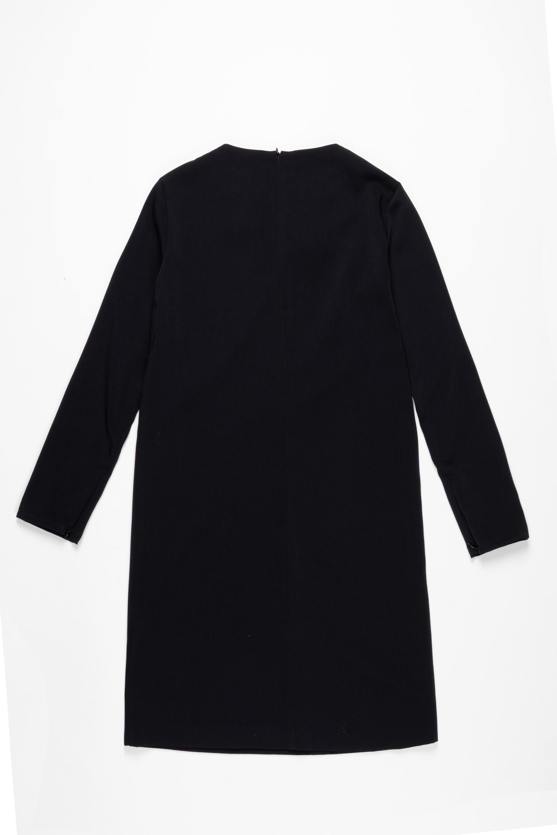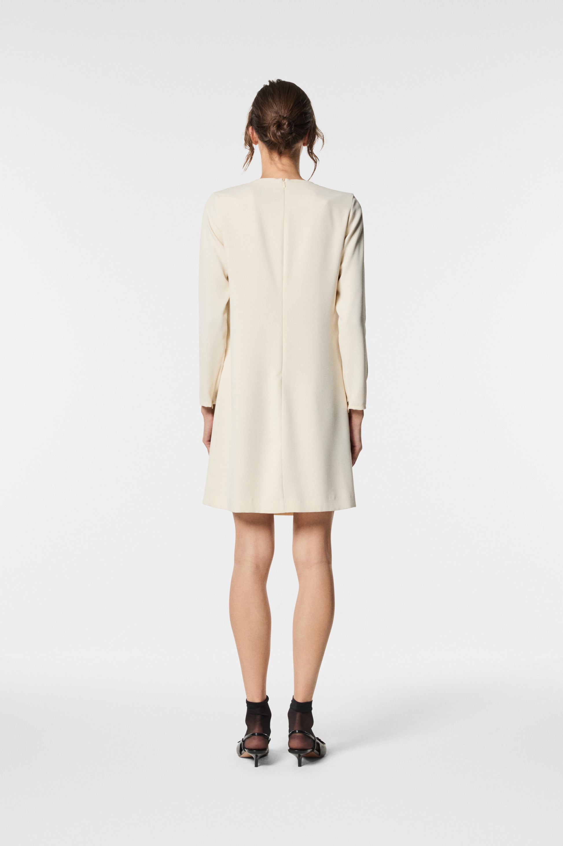 Abito corto con maniche lunghe e girocollo, impreziosito da un elegante dettaglio in catena dorata che illumina il design essenziale. Un modello dal carattere sofisticato e contemporaneo, perfetto per un look casual-chic che non passa inosservato.