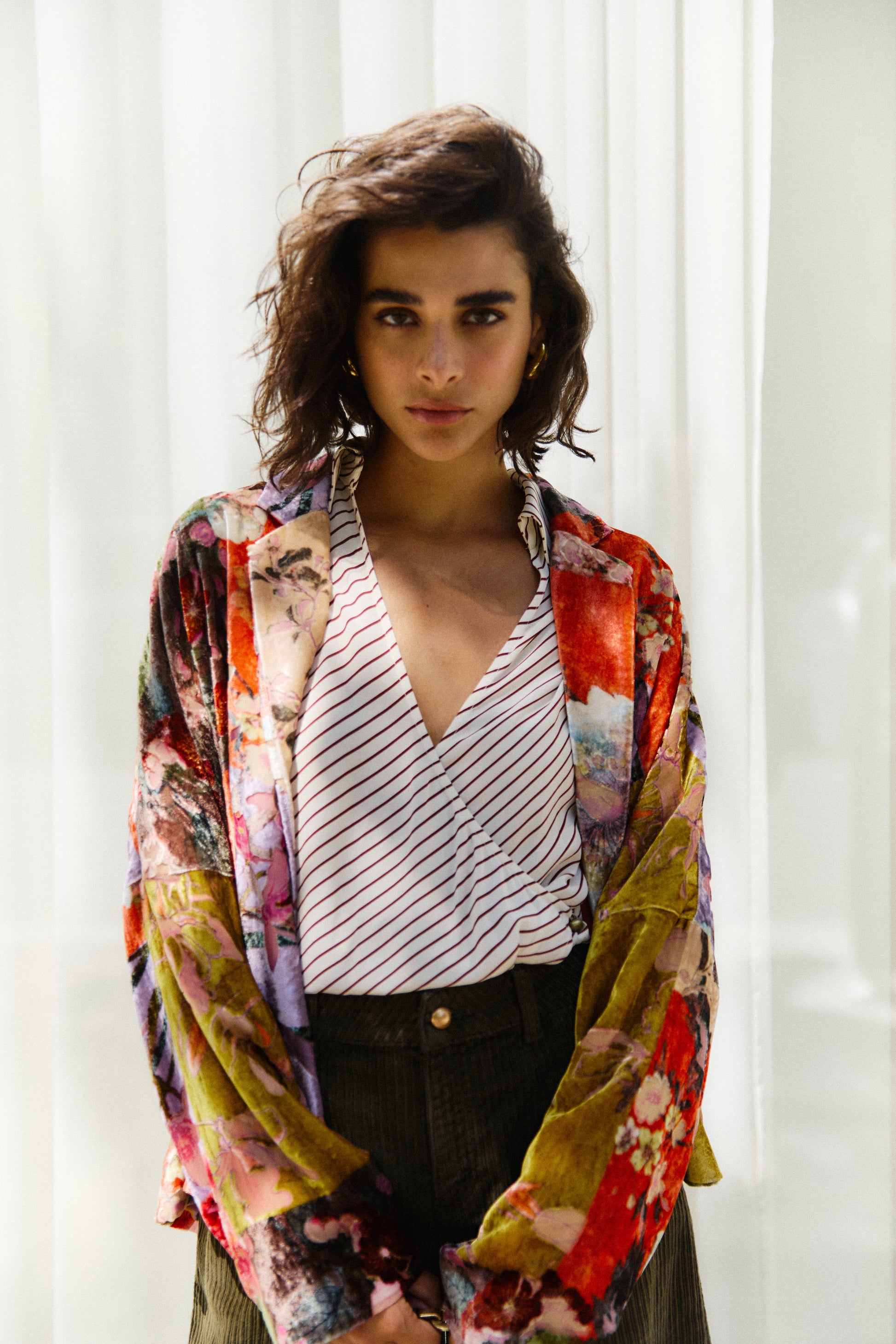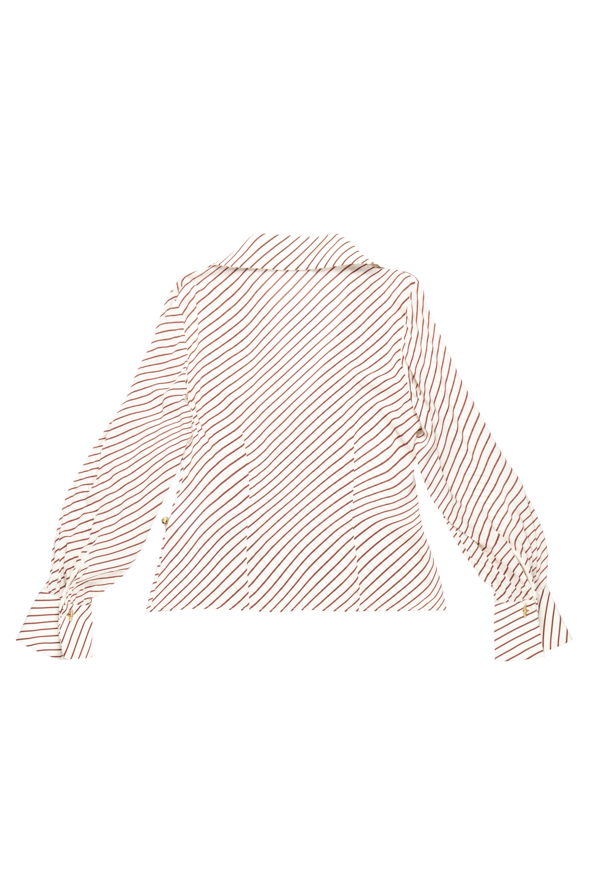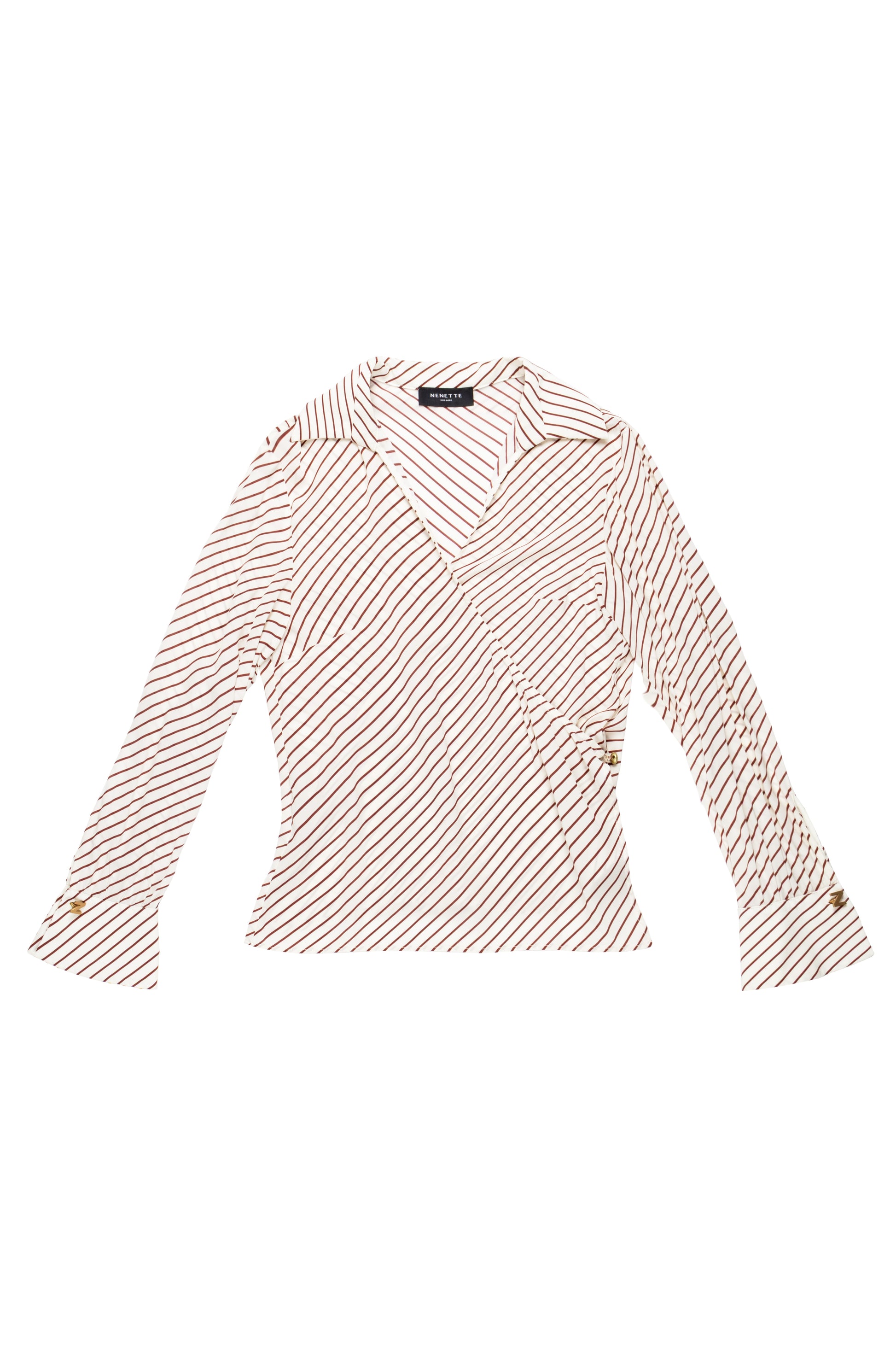 Blusa a manica lunga in viscosa con stampa a righe e chiusura incrociata. Polsini rifiniti con gemelli personalizzati NN. Linea fluida e femminile, valorizzata dal dettaglio avvolgente in vita. Un capo versatile e raffinato, perfetto per look eleganti e disinvolti con un tocco grafico.