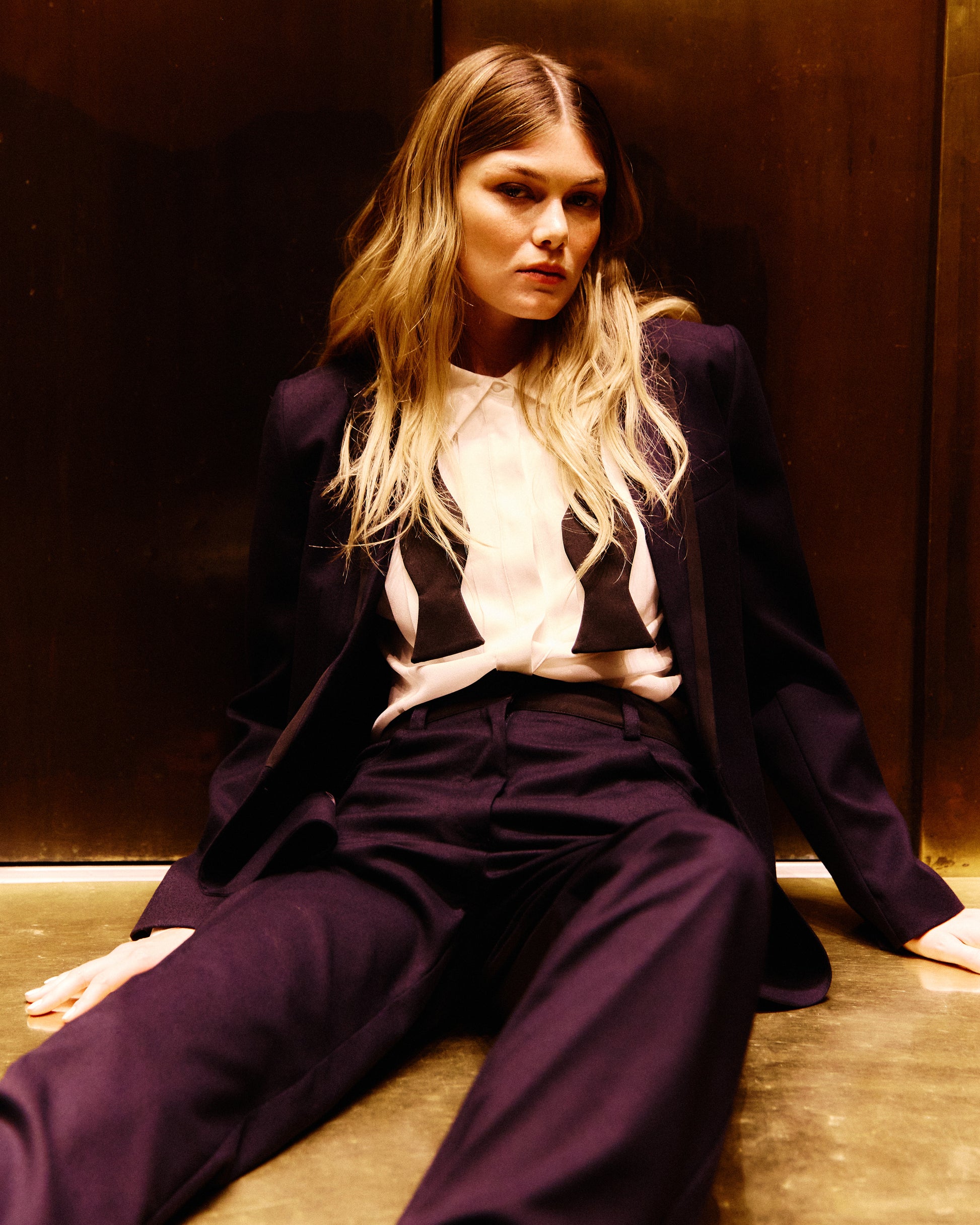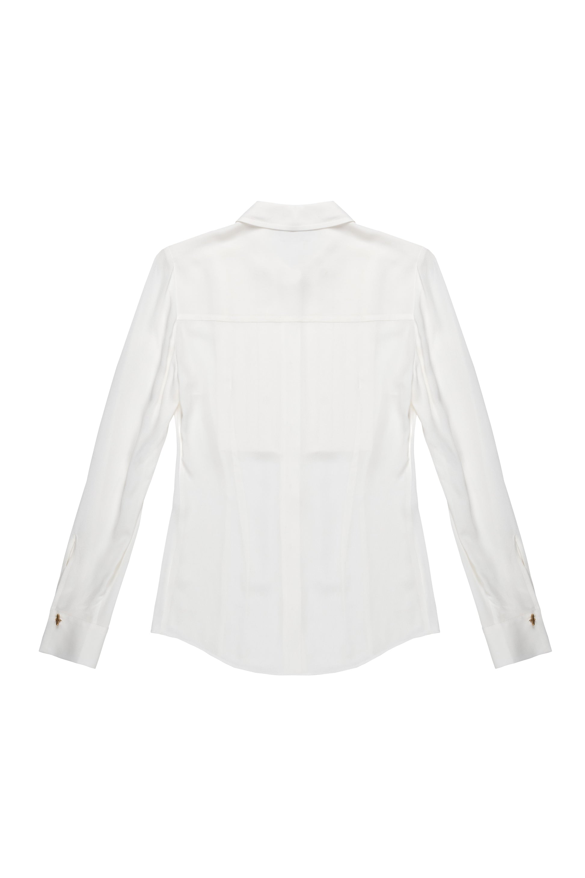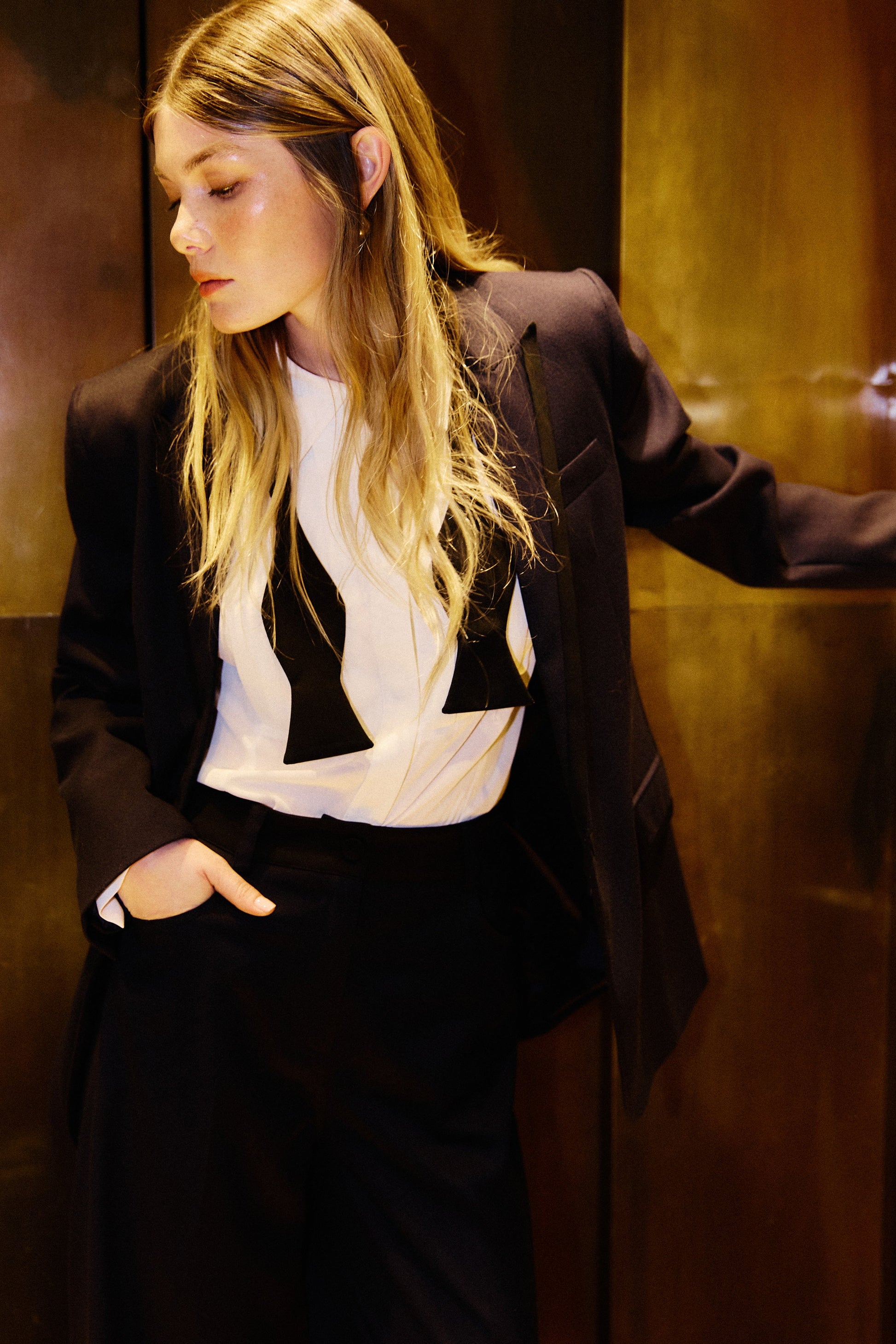 Camicia con plastron e papillon in viscosa, leggera e fluida. Dettaglio sartoriale con chiusura ai polsini tramite gemelli personalizzati NN. Un capo elegante e raffinato, ideale per look formali con un tocco distintivo e femminile.
