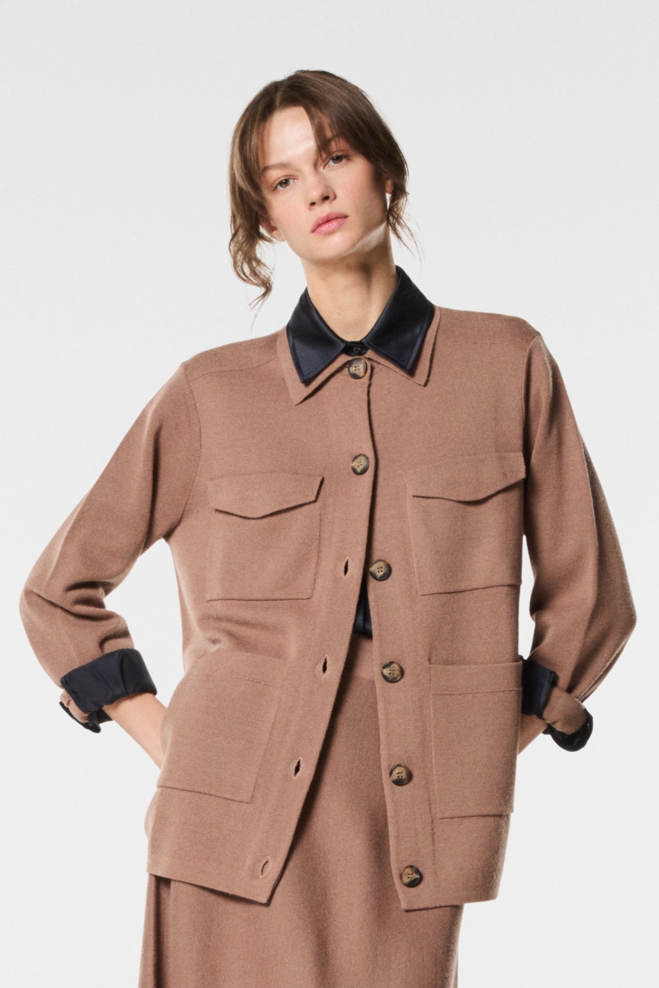 Field jacket in maglia, dal design contemporaneo e confortevole. La lavorazione del tessuto dona morbidezza e versatilità, mentre la linea ispirata all’outerwear classico è reinterpretata in chiave femminile e sofisticata. Un capo pratico ma elegante, perfetto per completare look quotidiani con stile disinvolto e ricercato.
