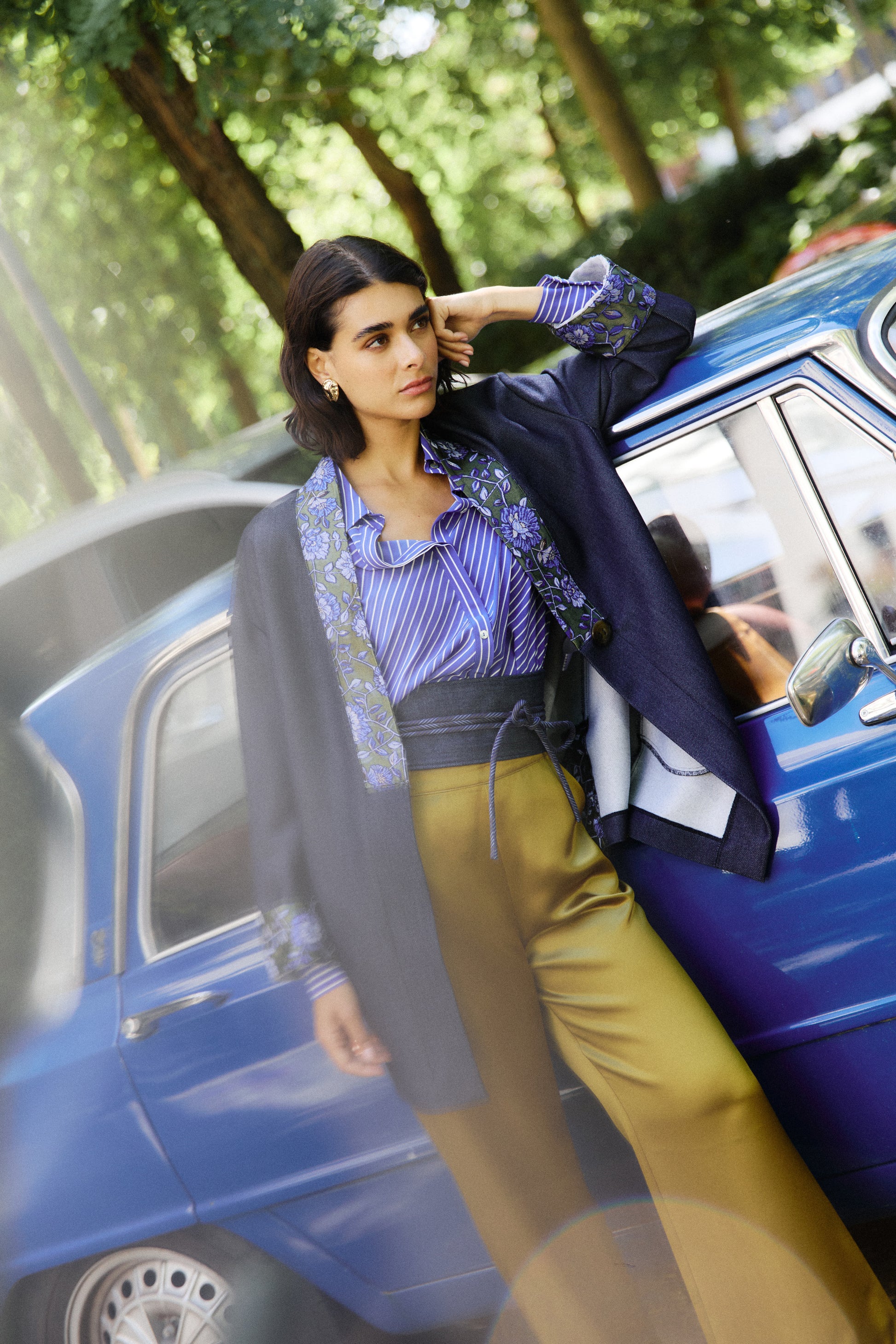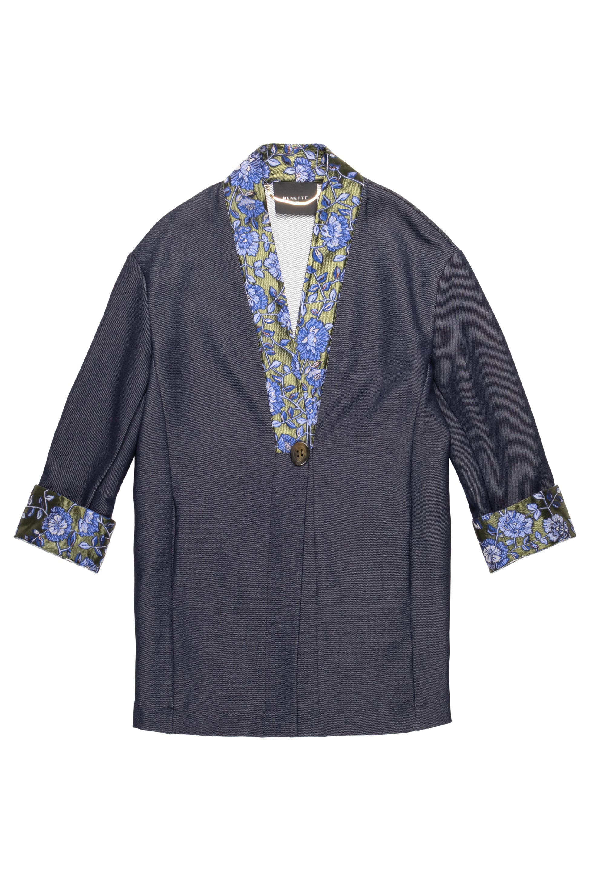 Giacca kimono in twill effetto denim patchwork e dettagli jacquard ricamati su colletto e polsini. Un mix originale di tradizione e stile contemporaneo. Linea morbida e design originale per un look dal carattere deciso e raffinato.