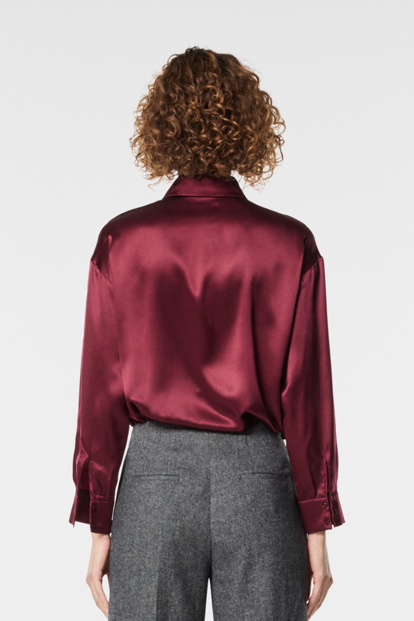 Camicia over in raso di seta, dal taglio fluido e luminoso. Il tessuto prezioso esalta la morbidezza delle linee, donando eleganza e comfort. Ideale per outfit sofisticati e versatili, combina un design moderno con un’eleganza classica senza tempo.