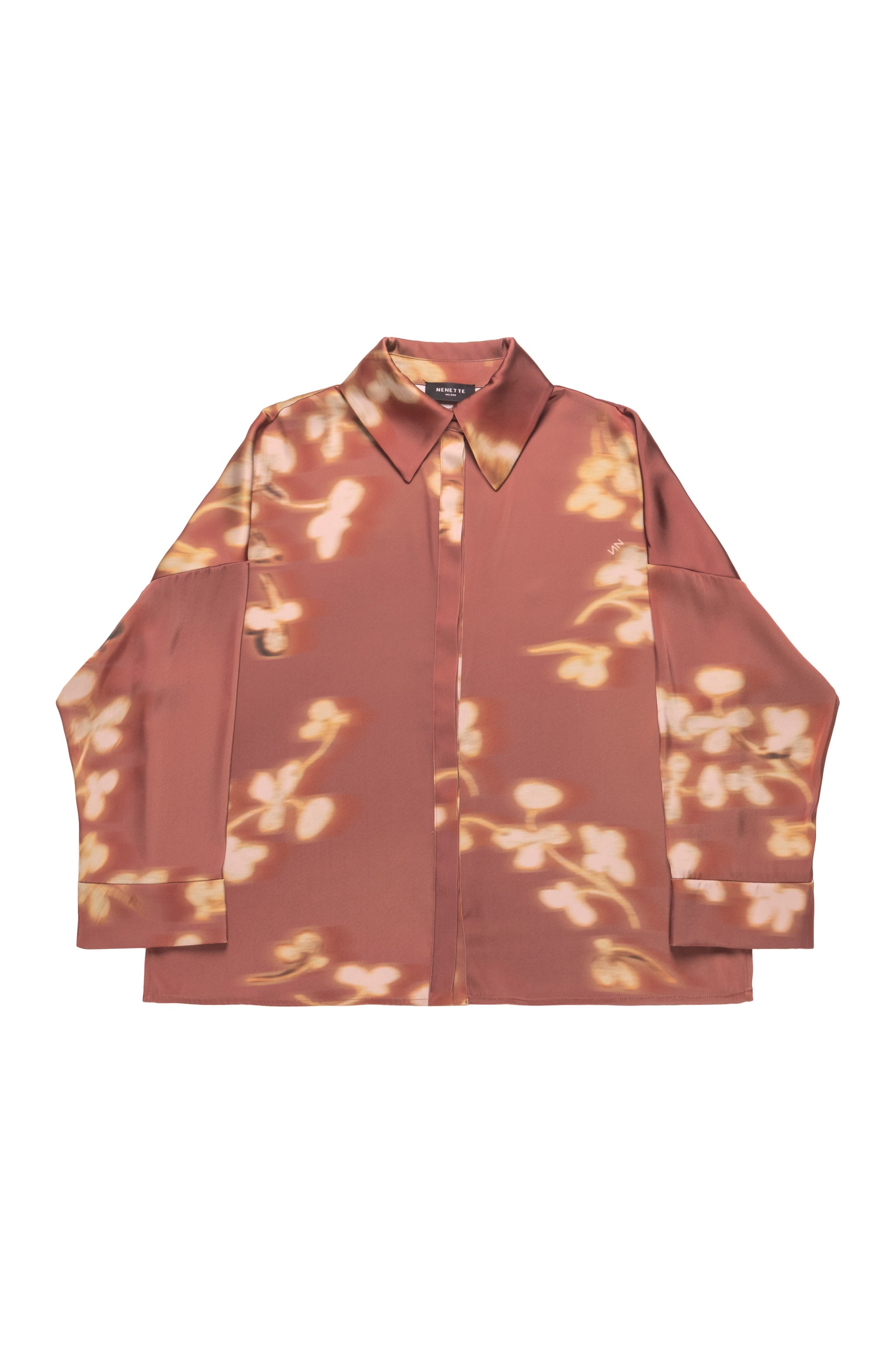 Camicia in raso poly stretch con stampa fiore chiné, fluida e luminosa. Il tessuto elasticizzato assicura comfort e vestibilità perfetta, mentre la stampa floreale dona un tocco romantico e raffinato. Ideale per look eleganti e femminili, perfetta da sola o sotto blazer.