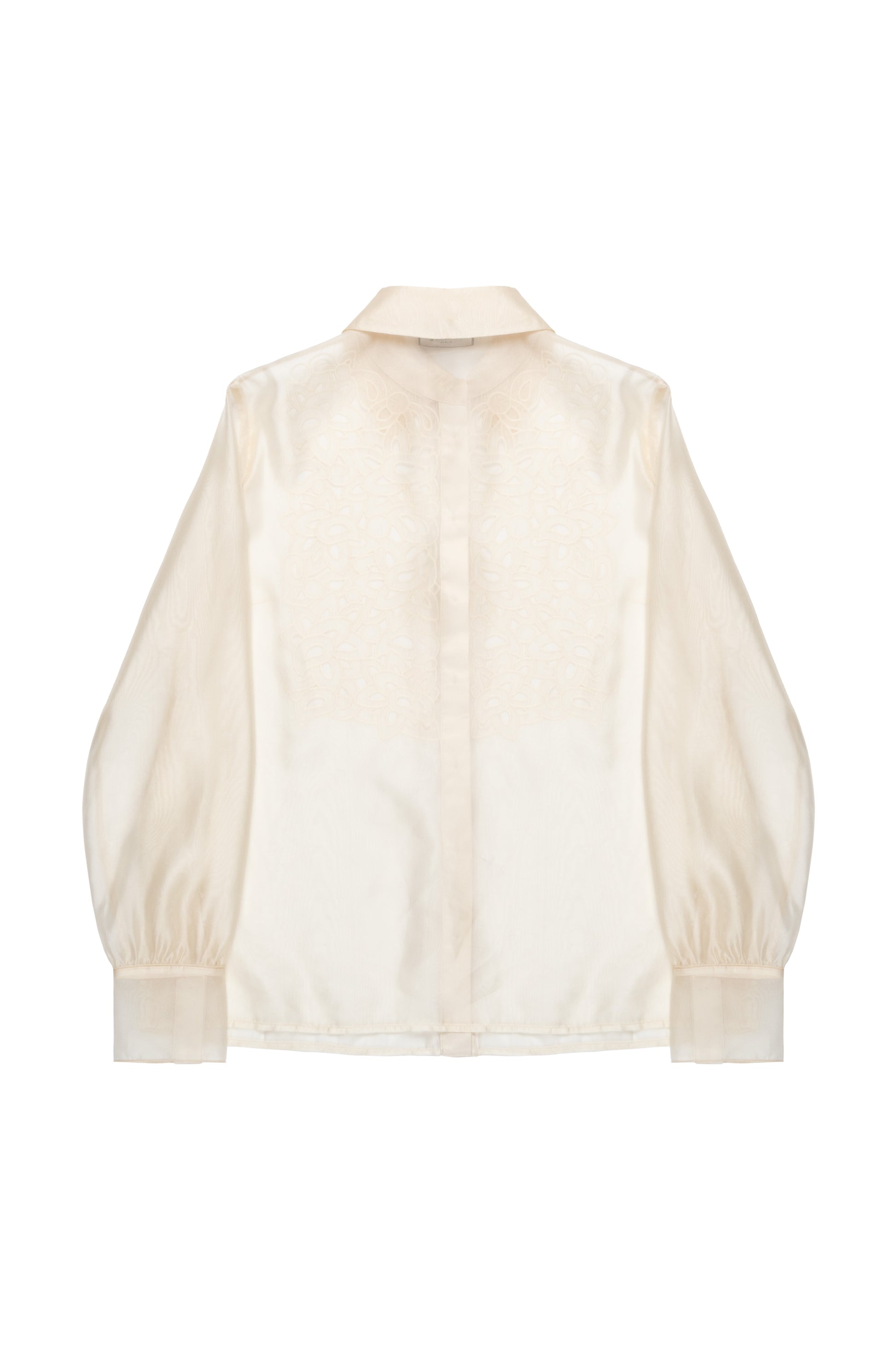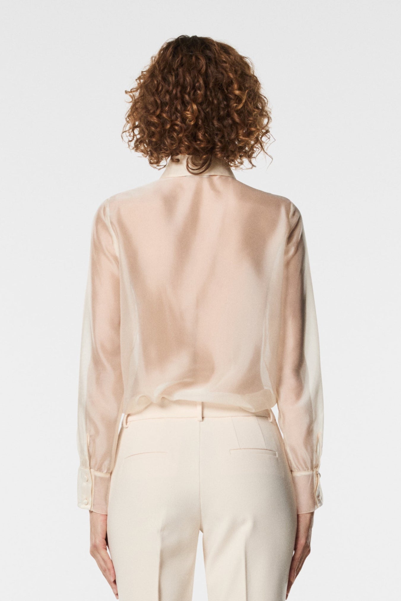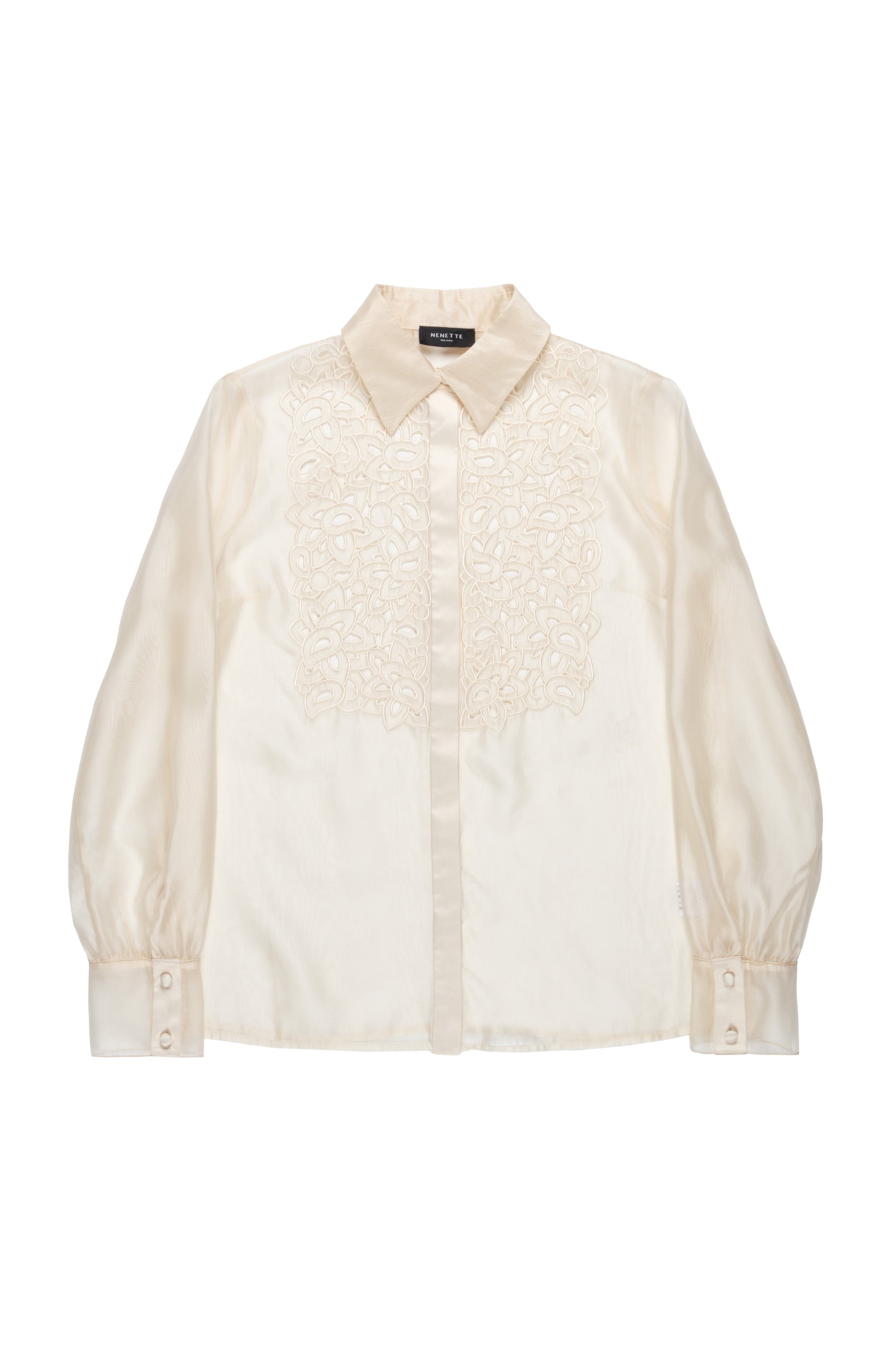 Camicia con plastron ricamato in organza, dal design elegante e raffinato. La trasparenza del plastron aggiunge un tocco sofisticato e femminile al taglio classico. Perfetta per look formali o casual ricercati, unisce sartorialità e delicatezza in un capo unico e versatile.