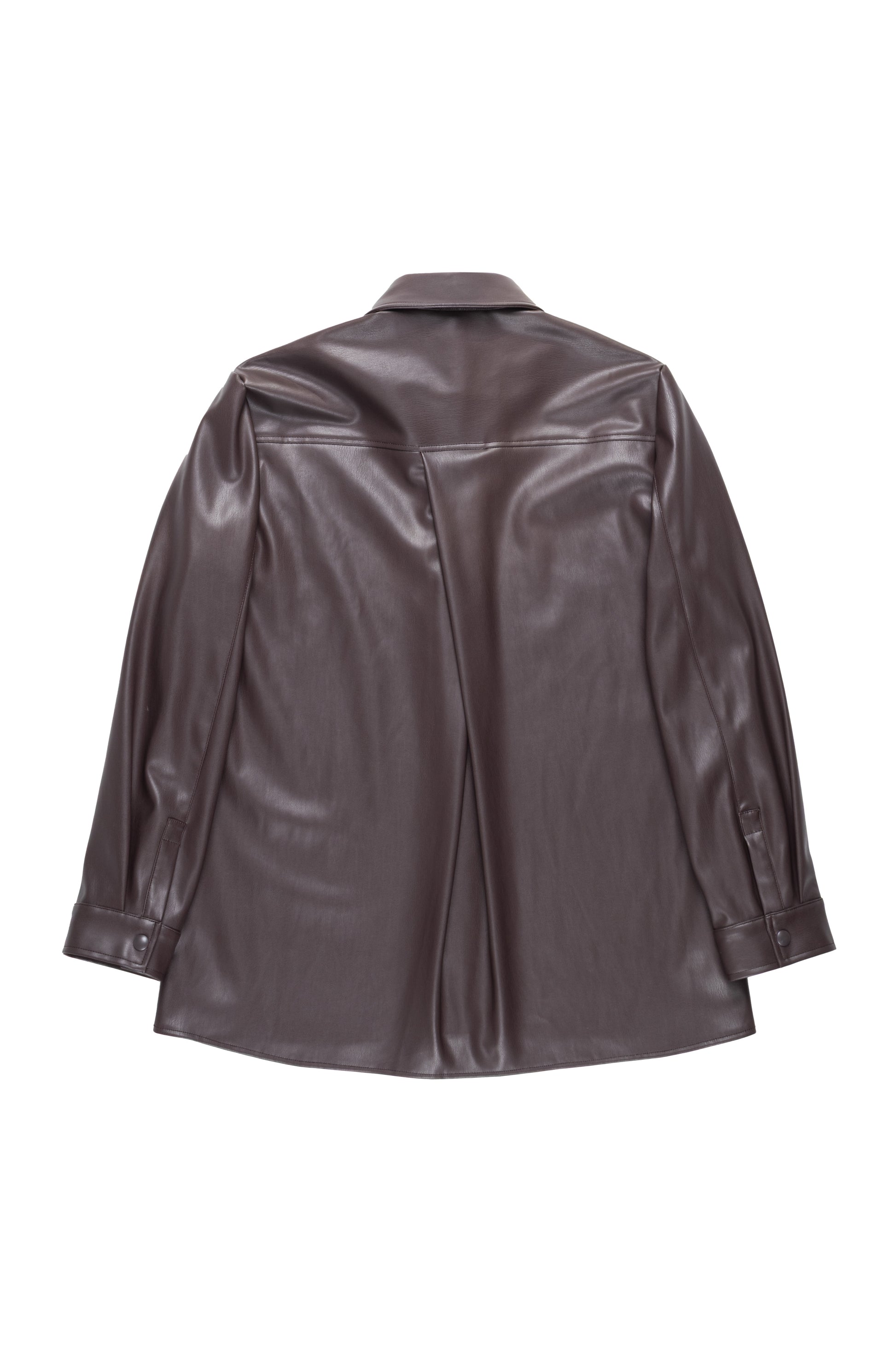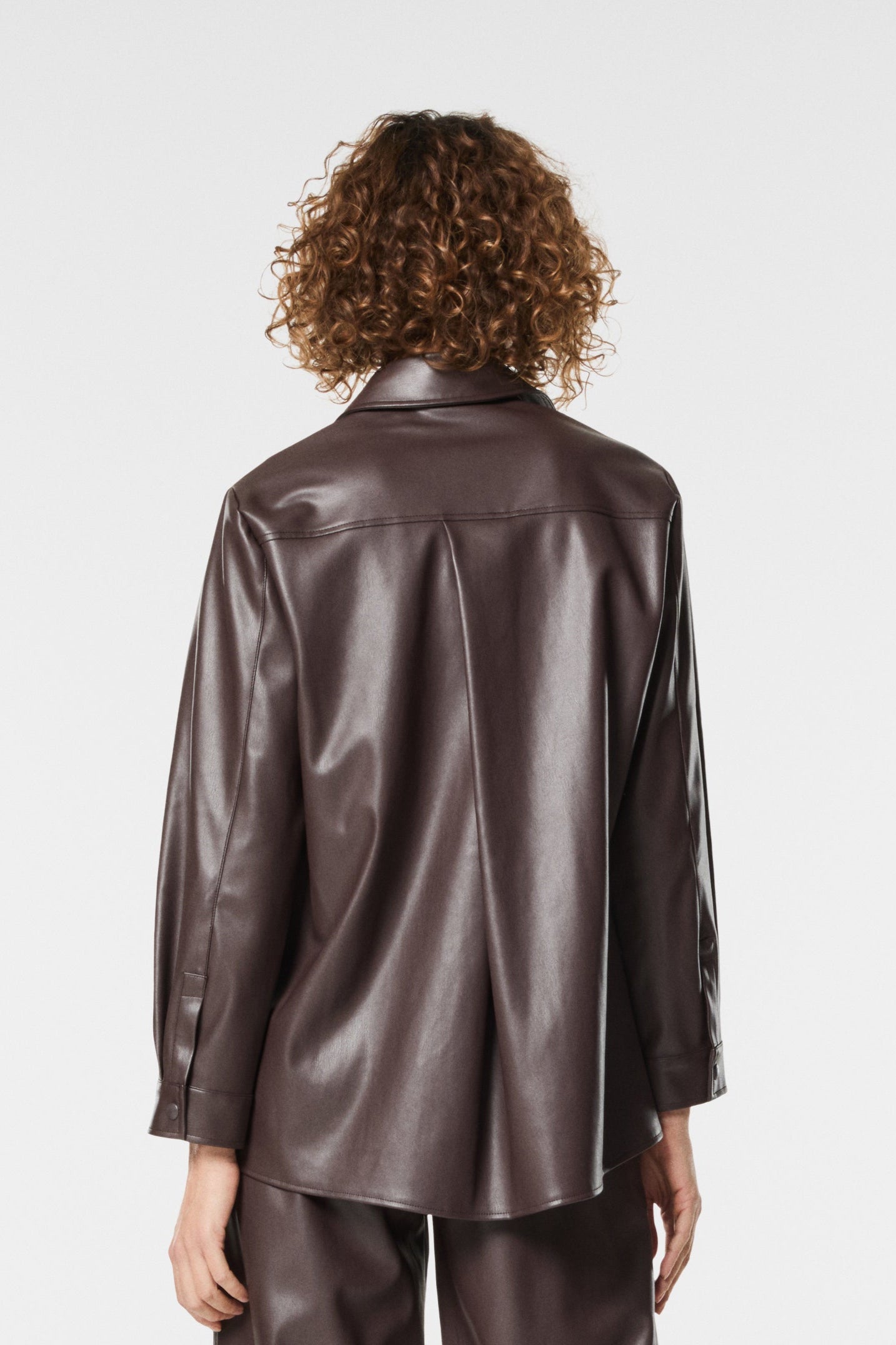 Camicia over in ecopelle caratterizzata da un ricamo sul petto, con un design moderno e deciso. La linea ampia e la struttura morbida garantiscono un comfort rilassato. Il ricamo dona un dettaglio elegante, ideale per outfit urban chic che combinano forza e femminilità con equilibrio.