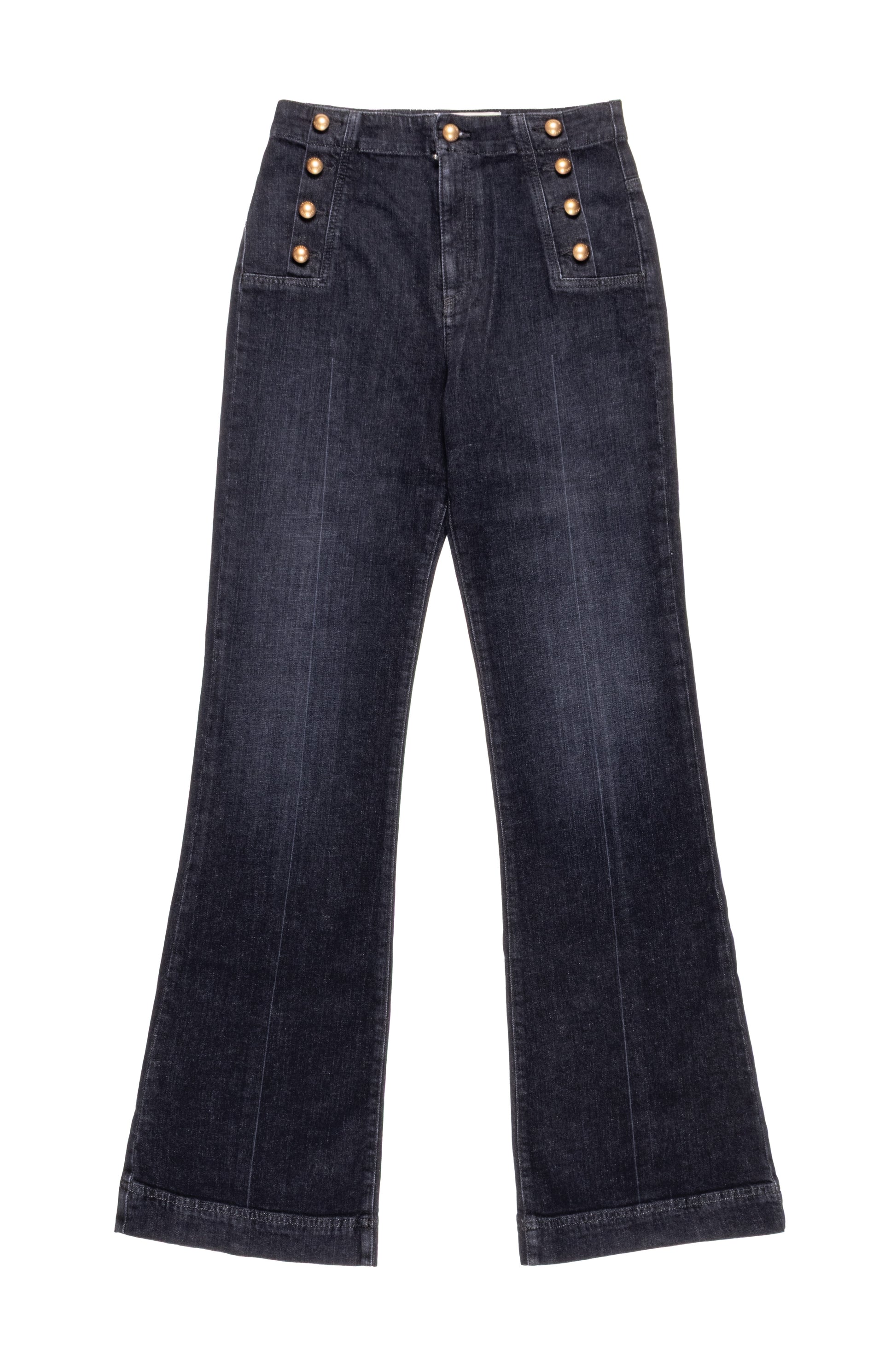 Pantalone a zampa in denim black comfort con bottoni decorativi sul davanti. Vita alta e tessuto elasticizzato per una vestibilità perfetta. Linea svasata che slancia la silhouette, ideale per un look casual-chic dal tocco retrò e sofisticato.