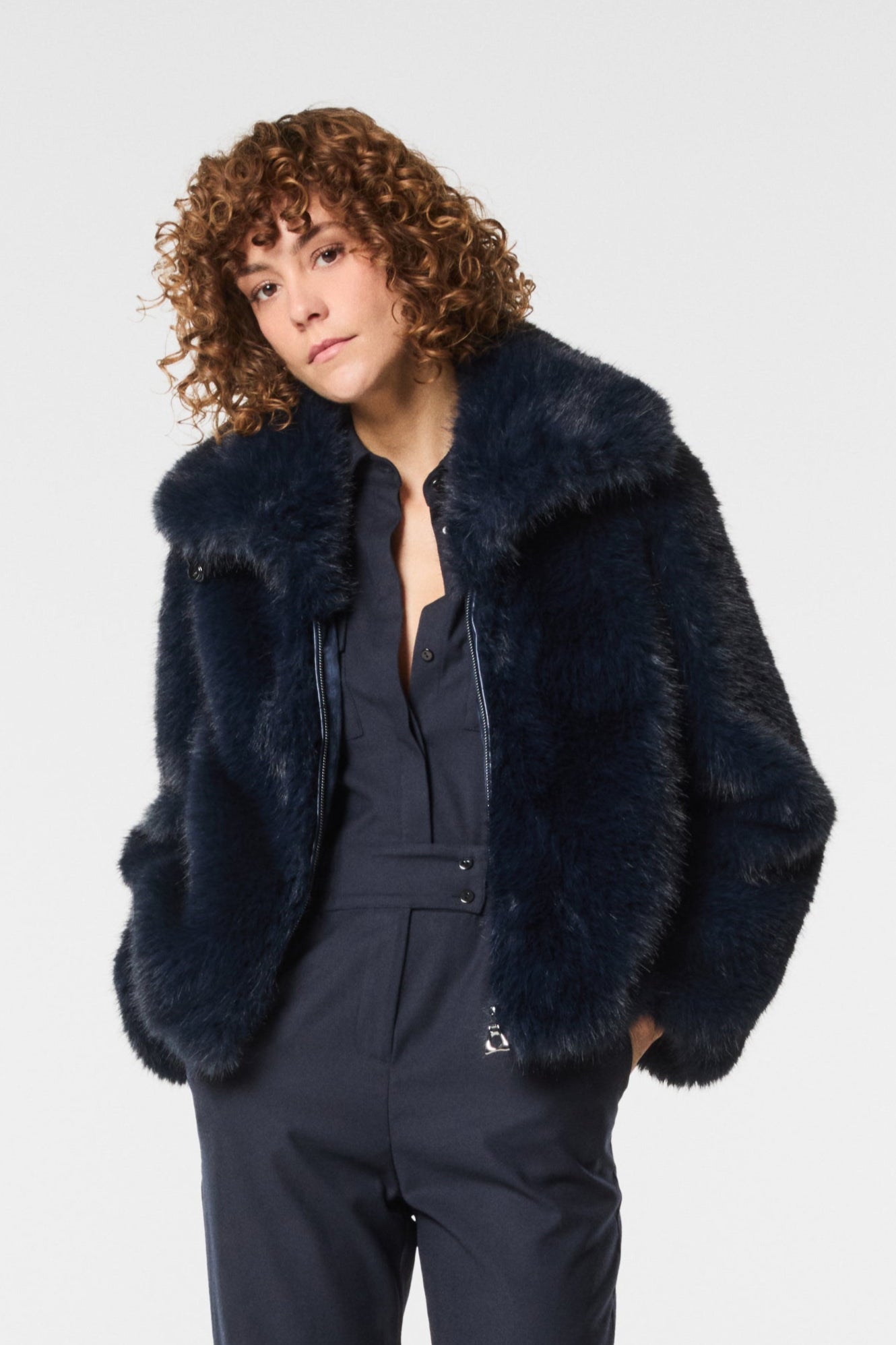 Giacca in ecovolpe dal design elegante e versatile. Morbida e calda, aggiunge un tocco di raffinatezza ai look quotidiani. Perfetta per outfit casual-chic che uniscono comfort e femminilità.