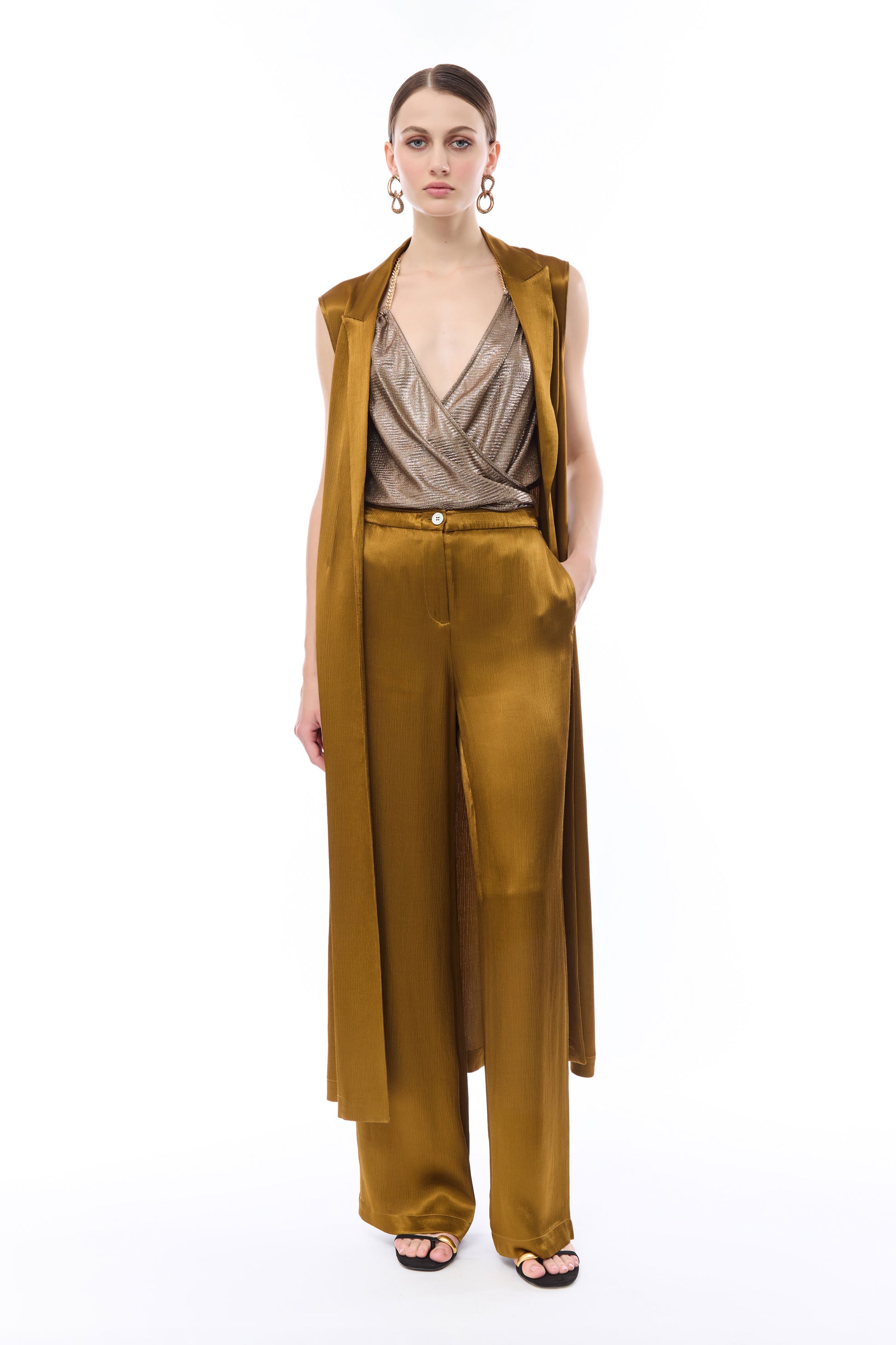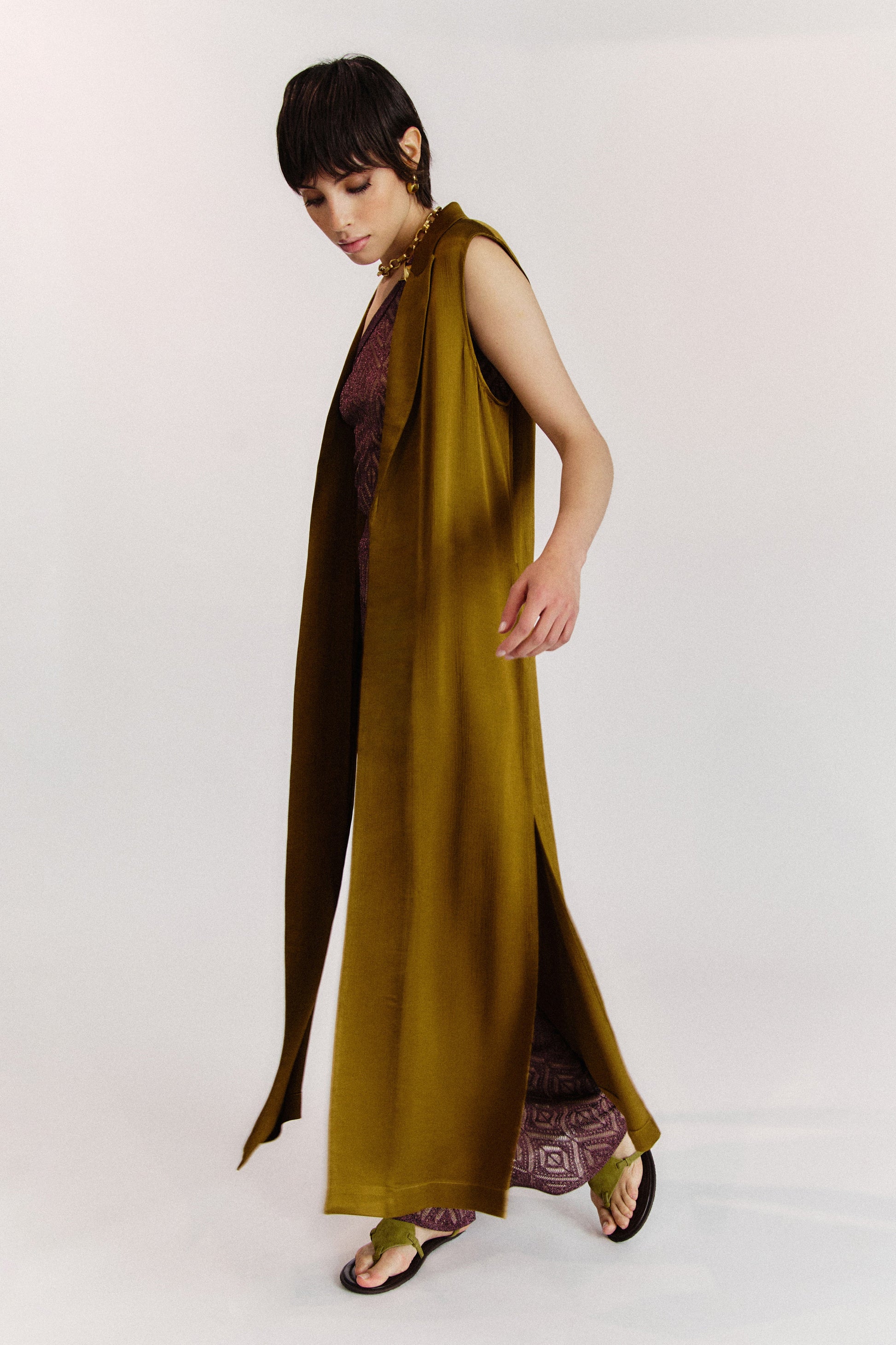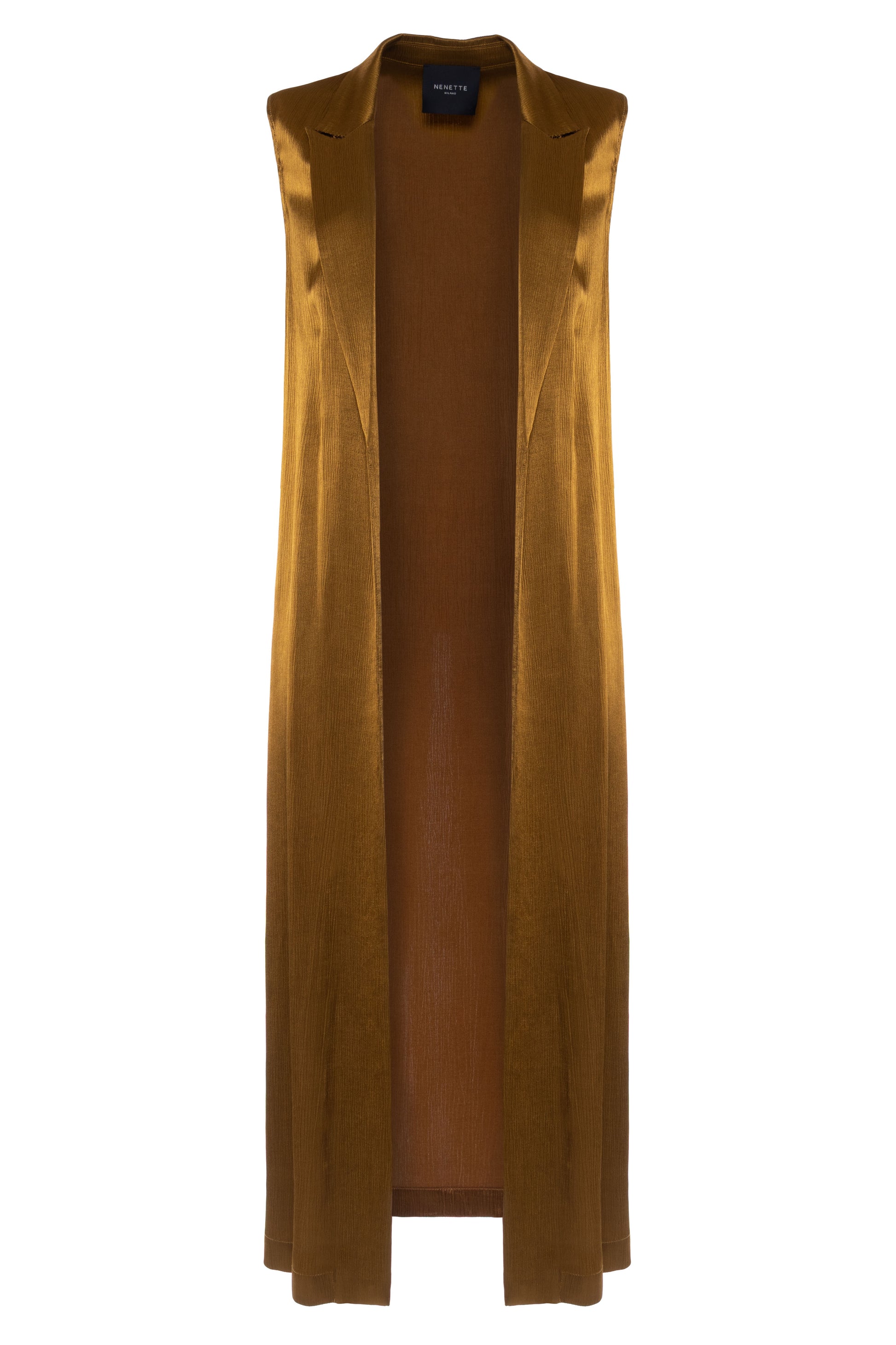 Raffinato gilet lungo dalla silhouette fluida, caratterizzato da classici revers a lancia e un design senza maniche. Il tessuto leggero presenta una texture luminosa dall'effetto cangiante che dona movimento a ogni passo. Linee pulite ed essenziali definiscono un capo versatile, perfetto per creare sofisticati giochi di sovrapposizioni e slanciare la figura con eleganza contemporanea.
