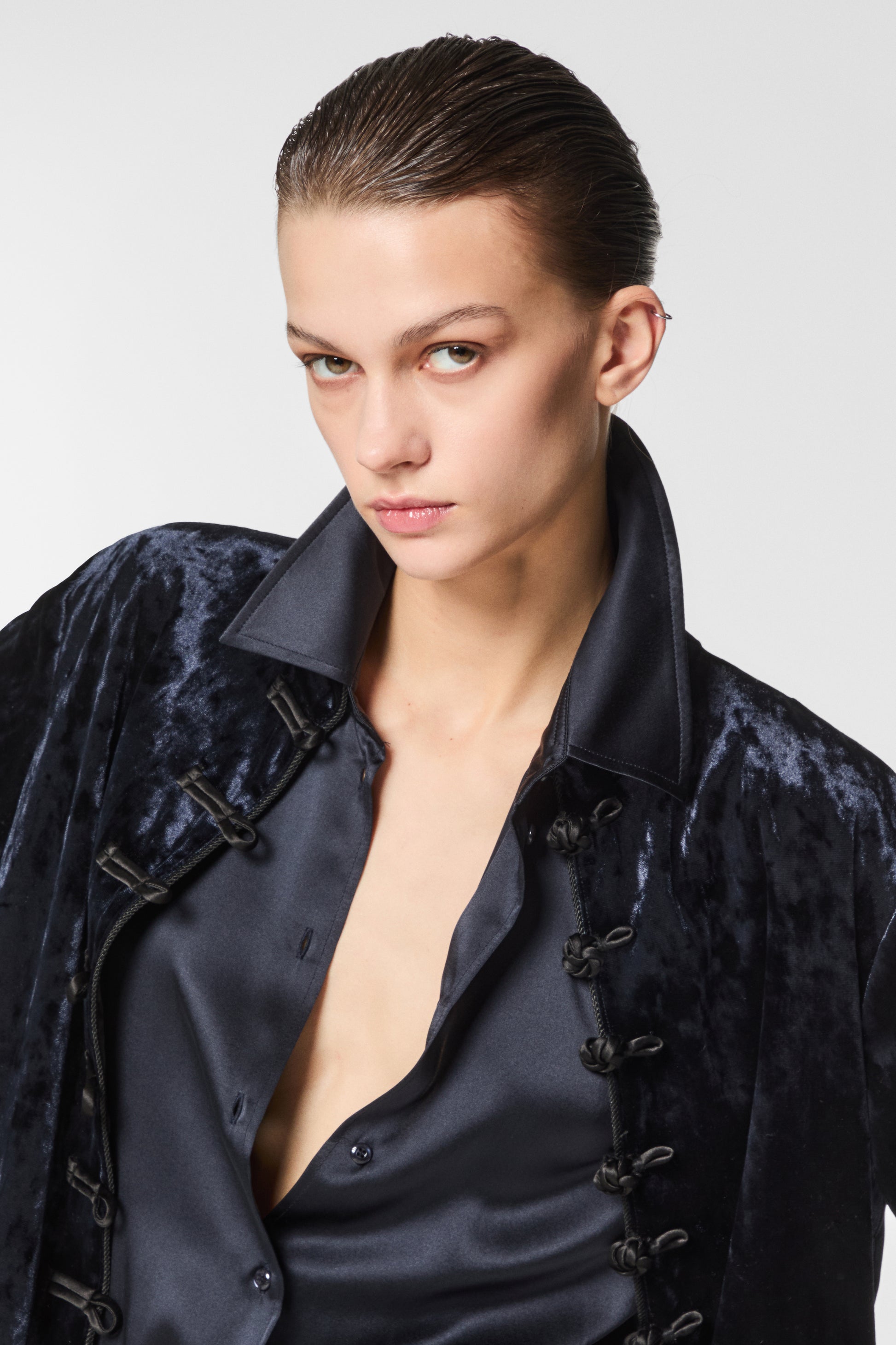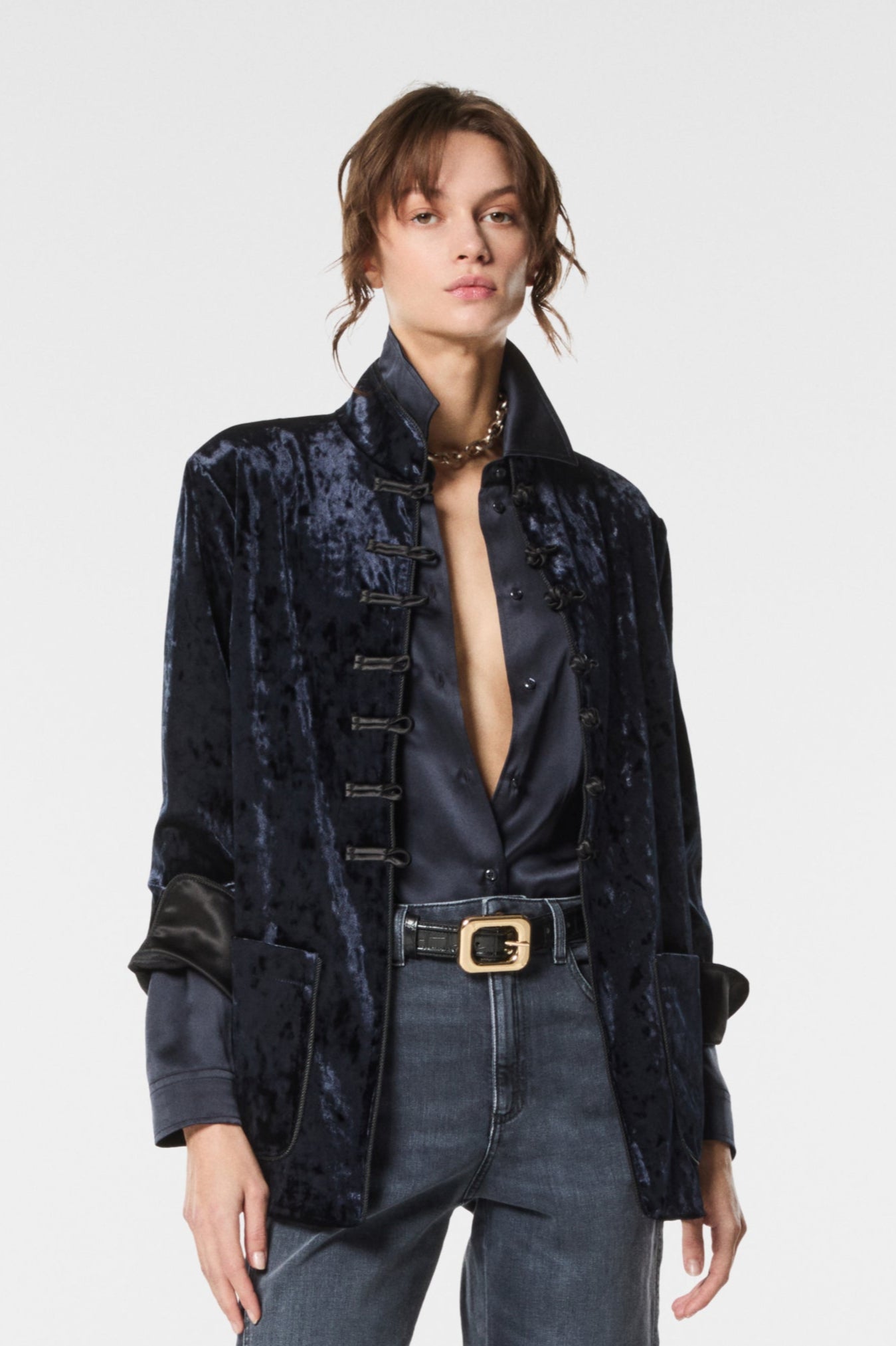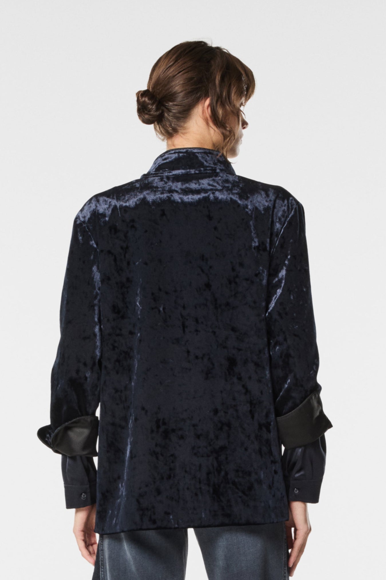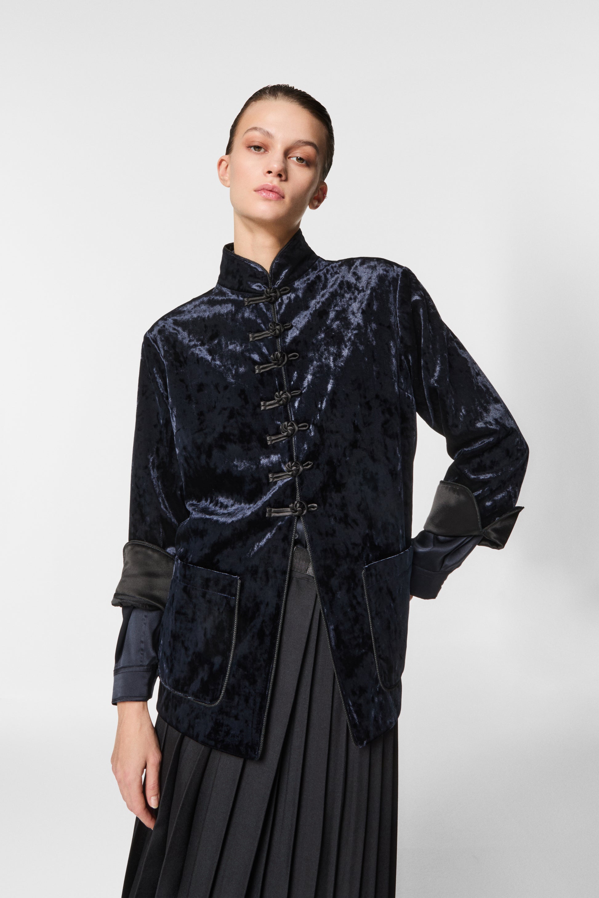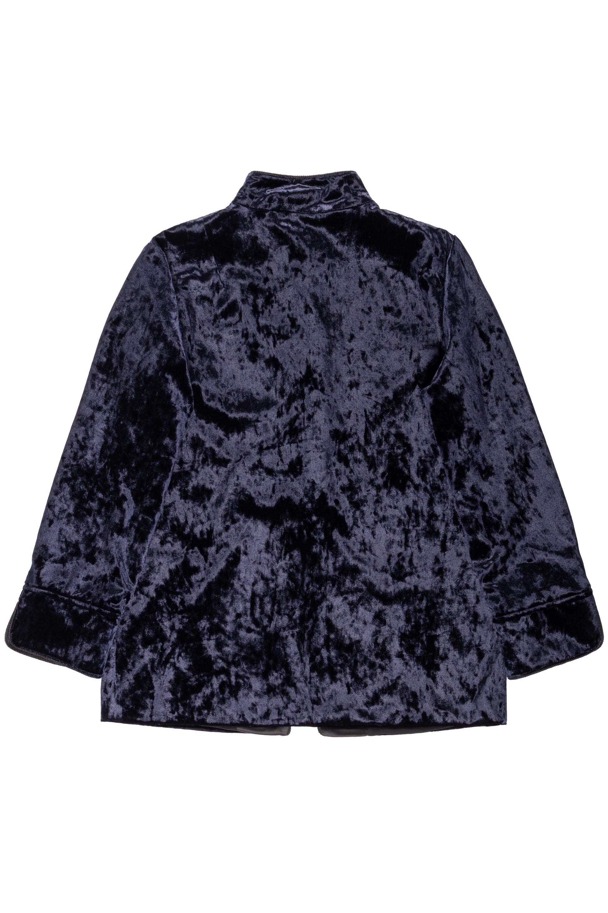 Giacca coreana in velluto mosso, elegante e originale. Il tessuto dalla texture irregolare dona movimento e profondità al capo, valorizzando la linea essenziale del collo alla coreana. Perfetta per look sofisticati con un tocco contemporaneo.