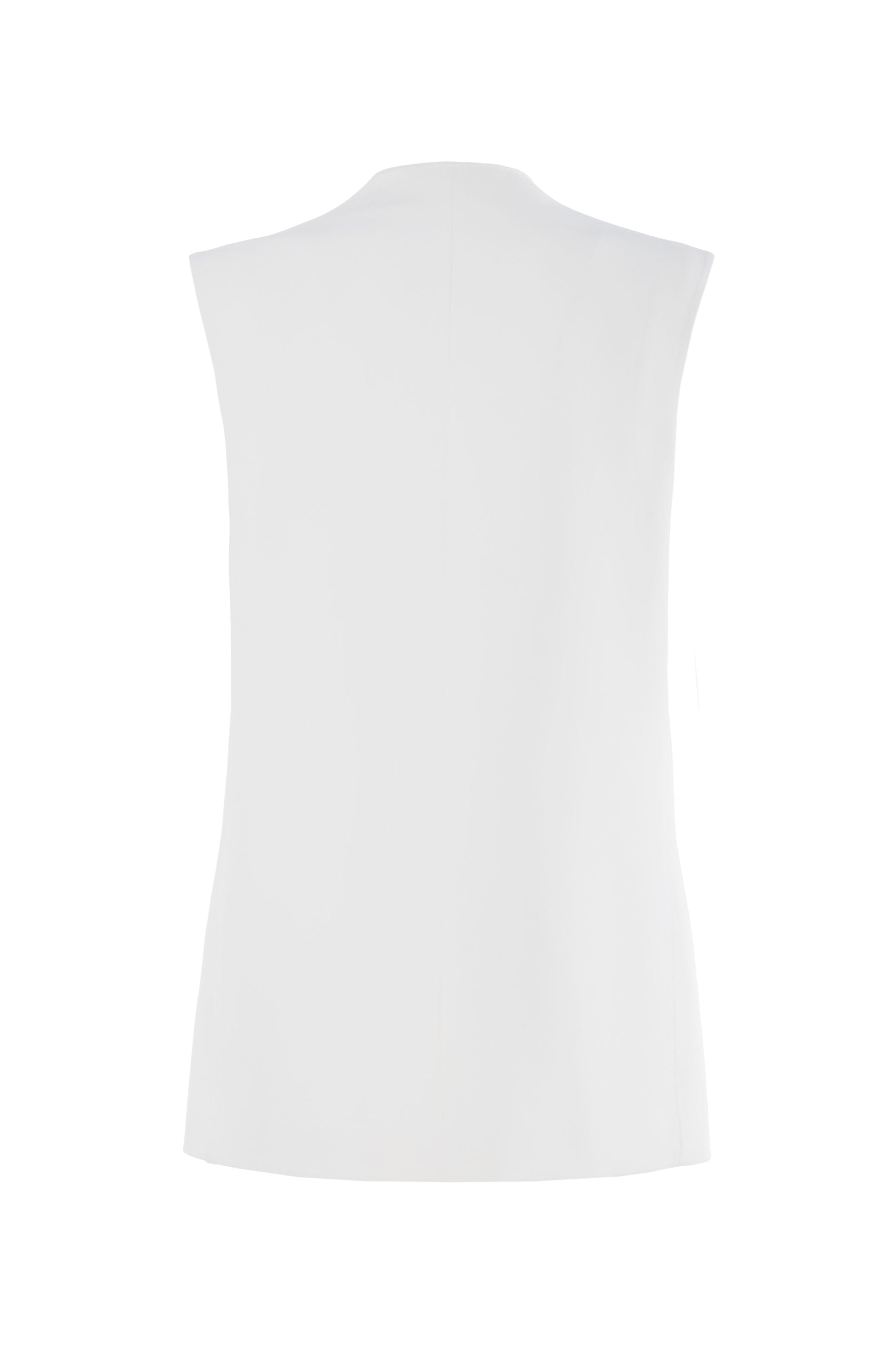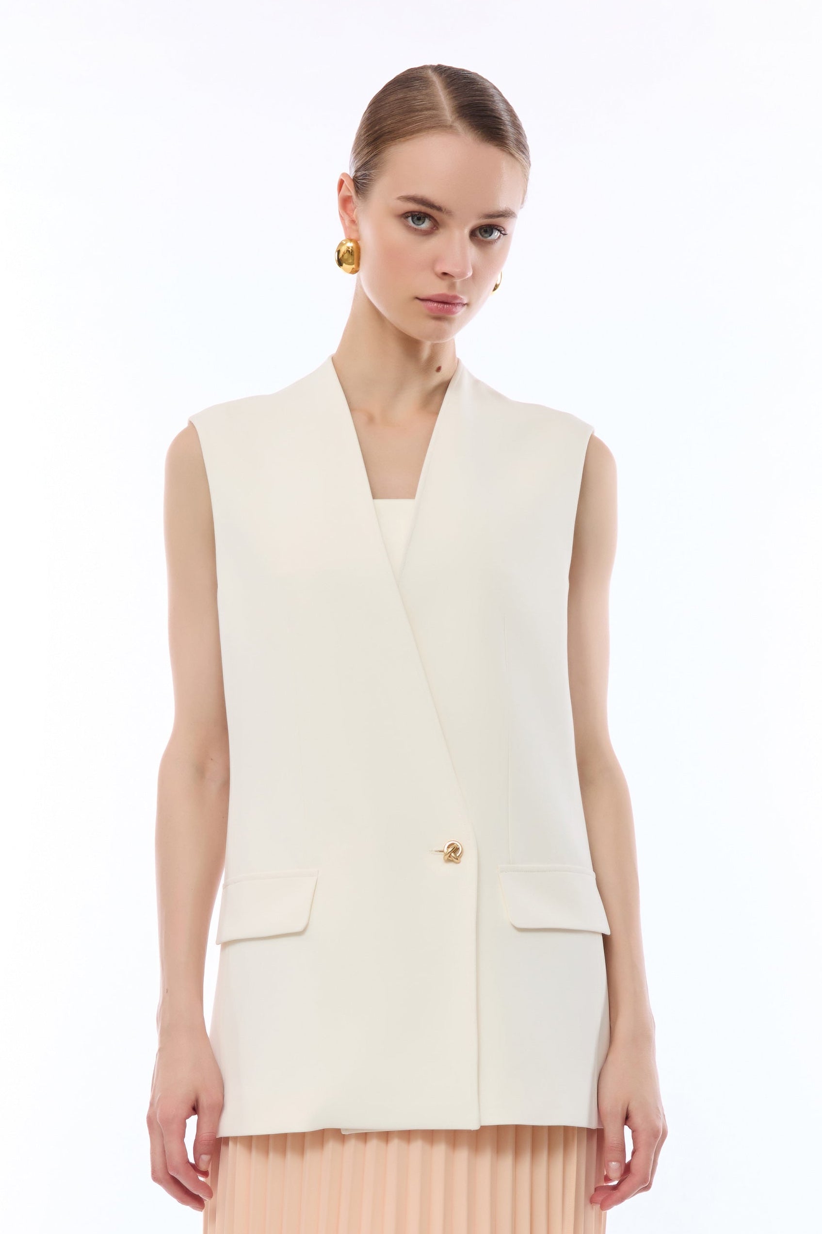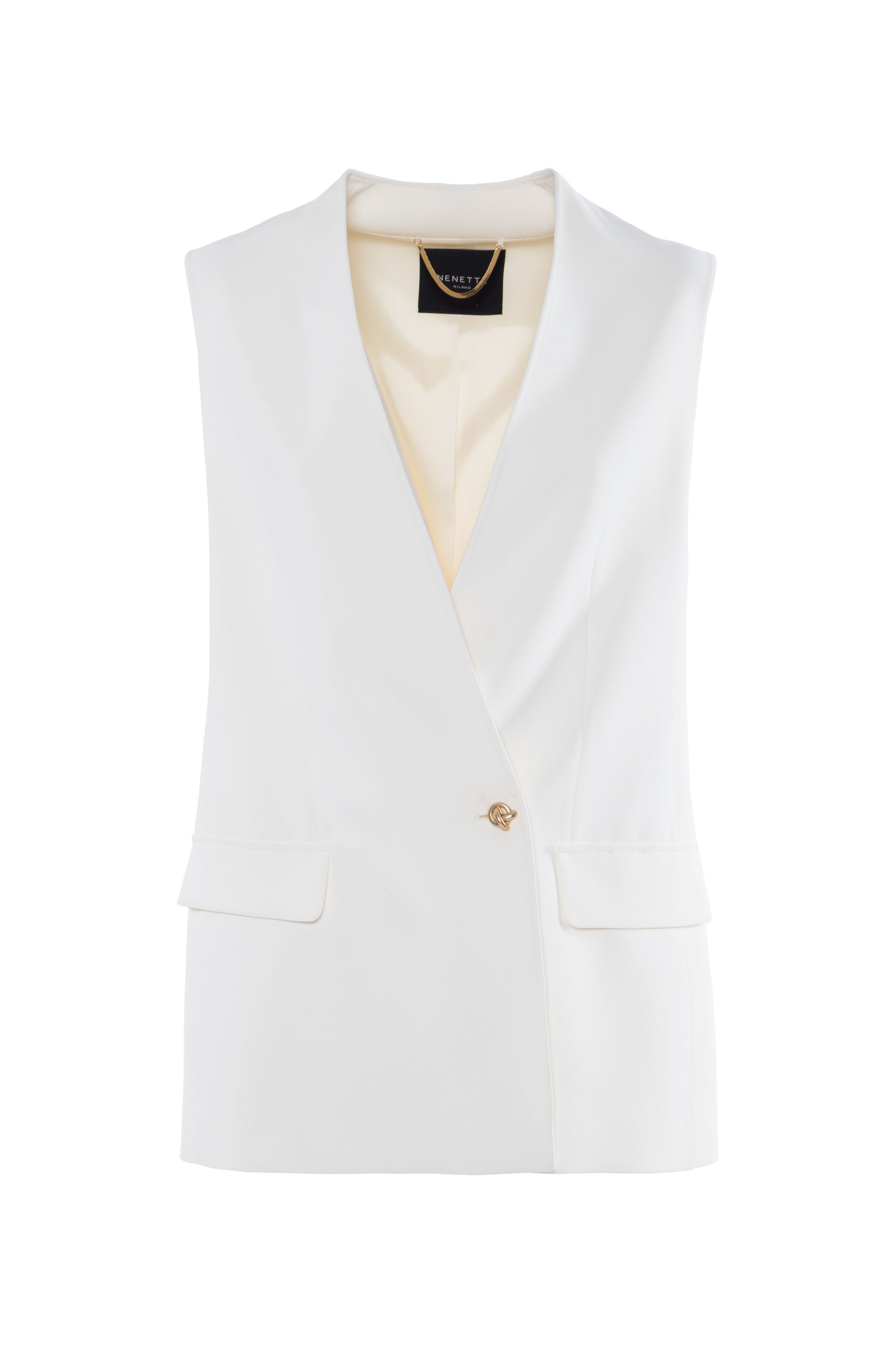 Elegante gilet dal taglio sartoriale con scollo a V e chiusura monopetto, definita da un raffinato bottone gioiello dorato. La silhouette strutturata presenta tasche laterali con patta e un profilo pulito senza maniche, ideale per sovrapposizioni ricercate. Rifinito internamente con cura, rappresenta un capo versatile per completare outfit formali o casual chic.