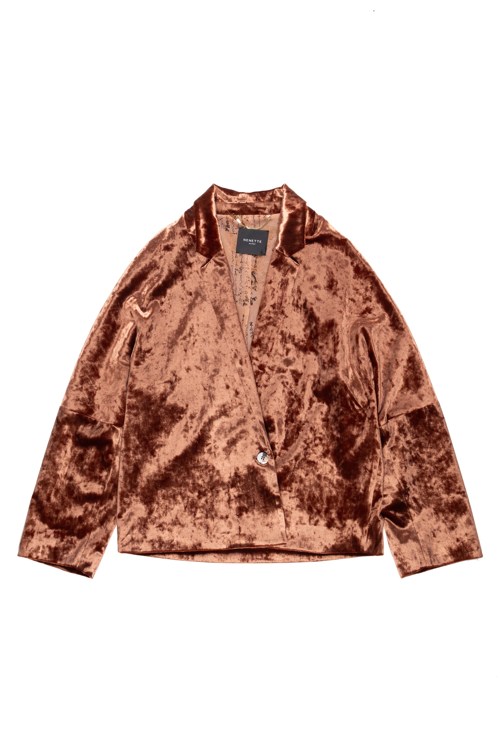 Giacca kimono corta in velluto dall’effetto mosso, morbida e luminosa. Il taglio essenziale incontra la ricercatezza del tessuto, creando un capo elegante e sofisticato. Versatile e attuale, si indossa con facilità sia su look formali che su outfit casual-chic.
