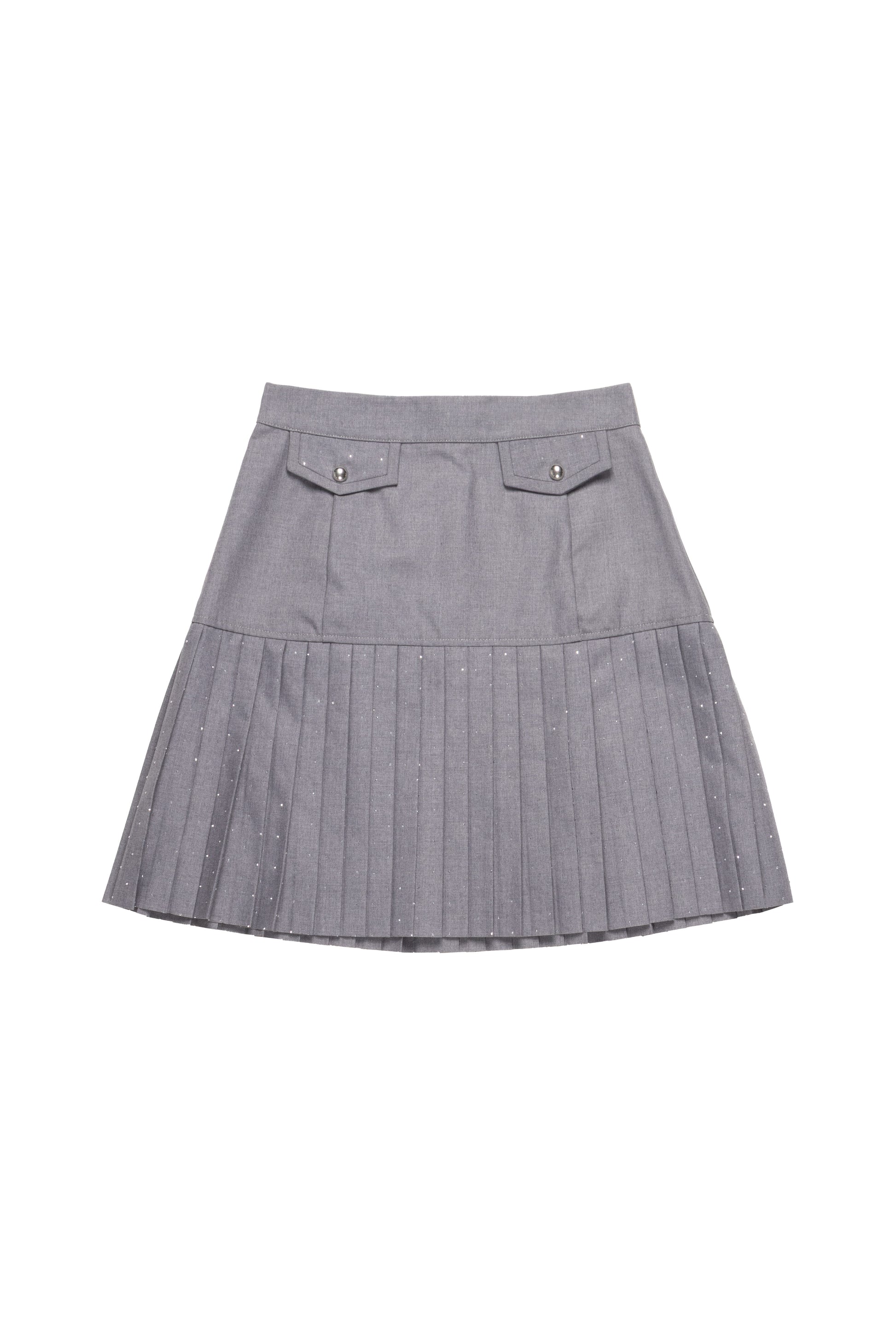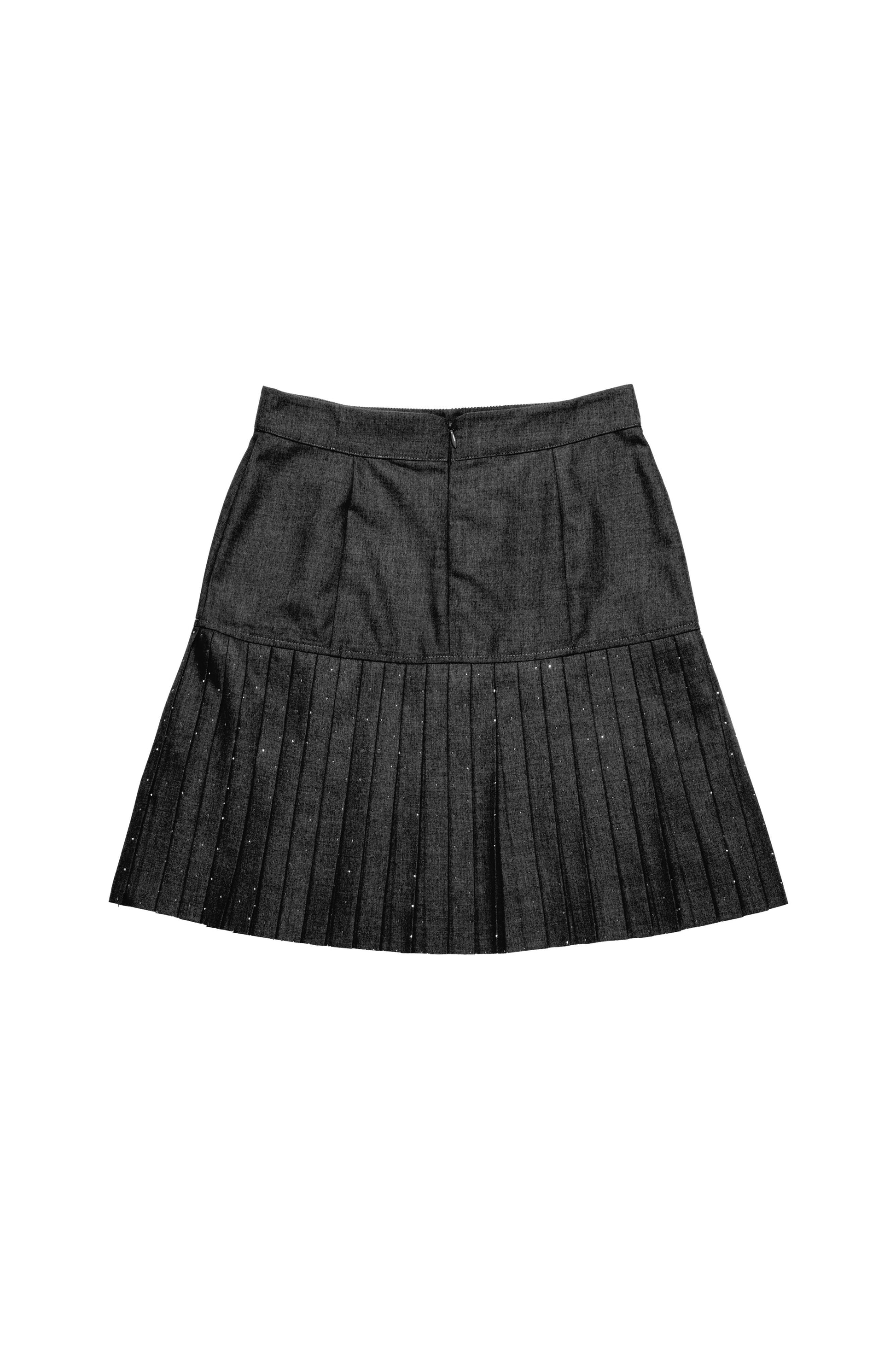 Gonna corta in tessuto poly/viscosa, impreziosita da un pannello plissé con full strass che illumina il modello. Femminile e sofisticata, unisce linee moderne a dettagli preziosi, perfetta per distinguersi con eleganza. Ideale per outfit serali o per aggiungere un tocco brillante a look più essenziali.