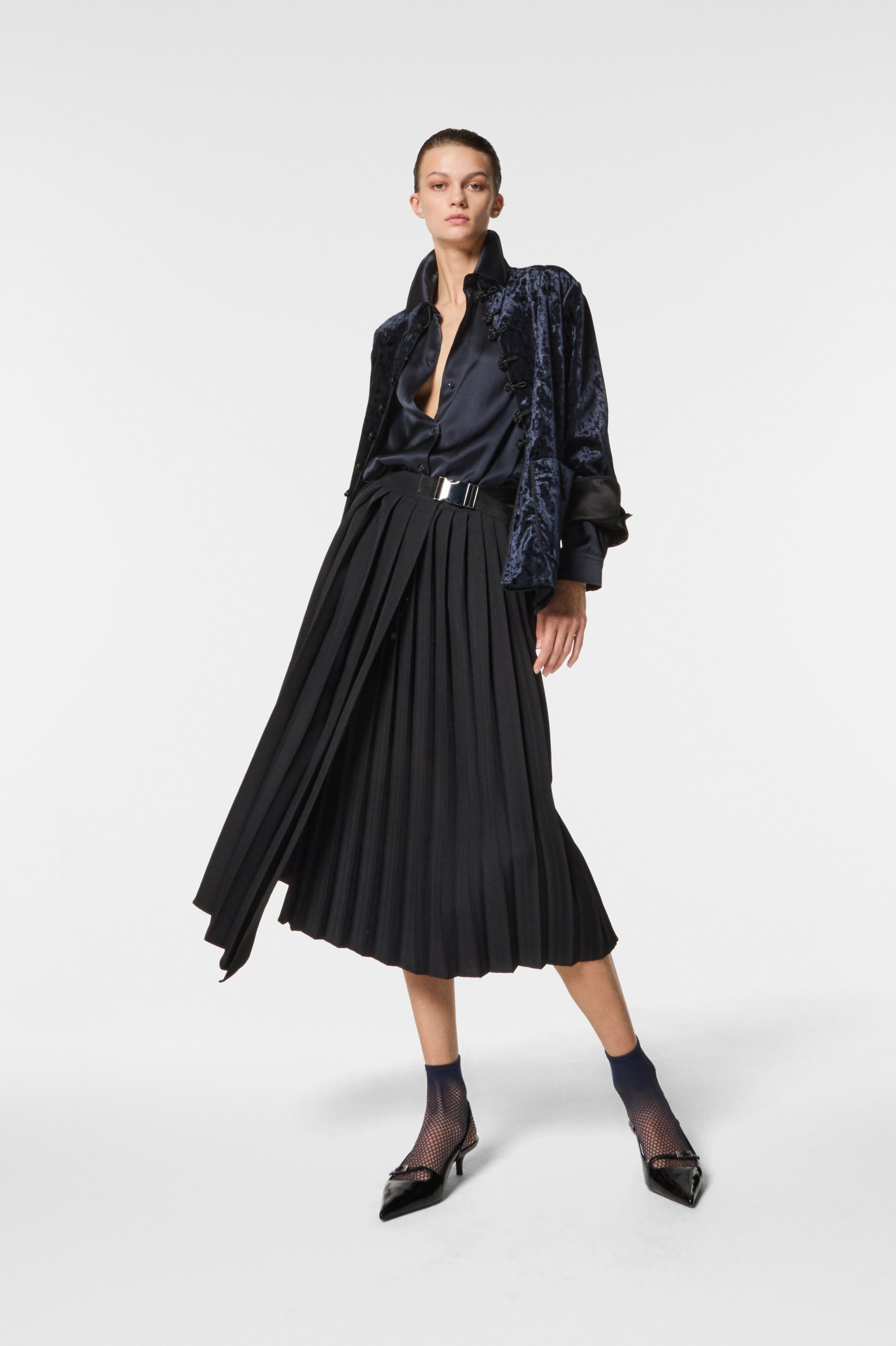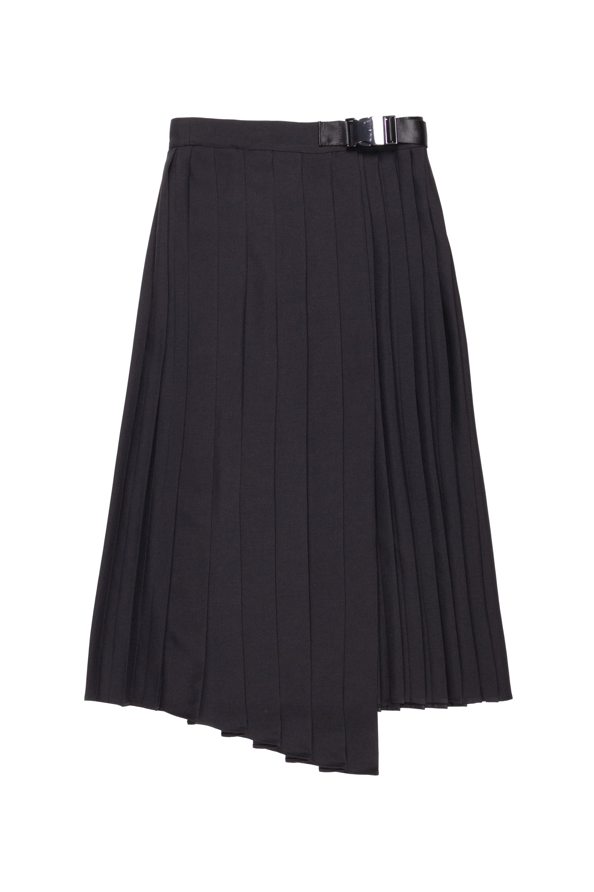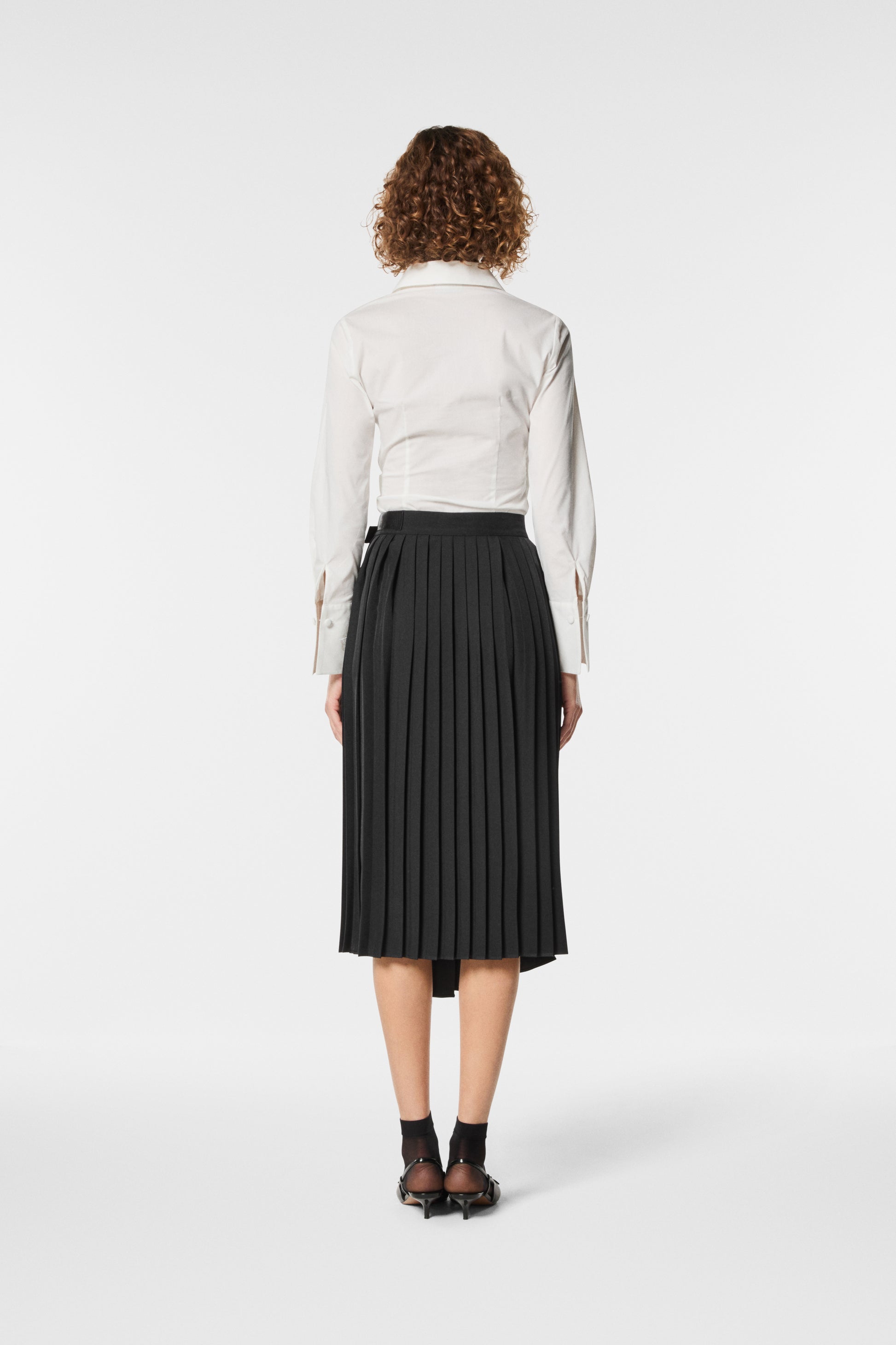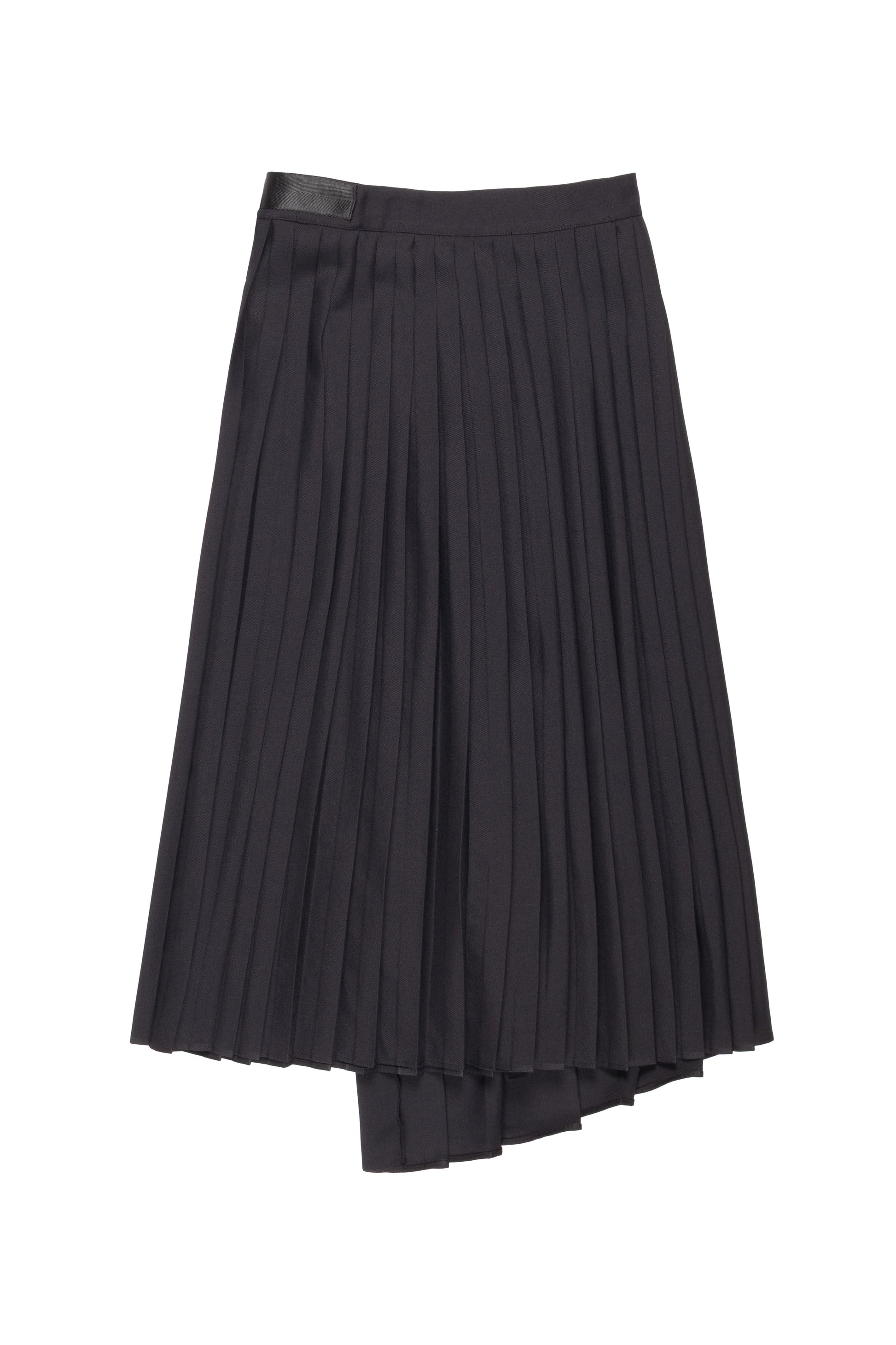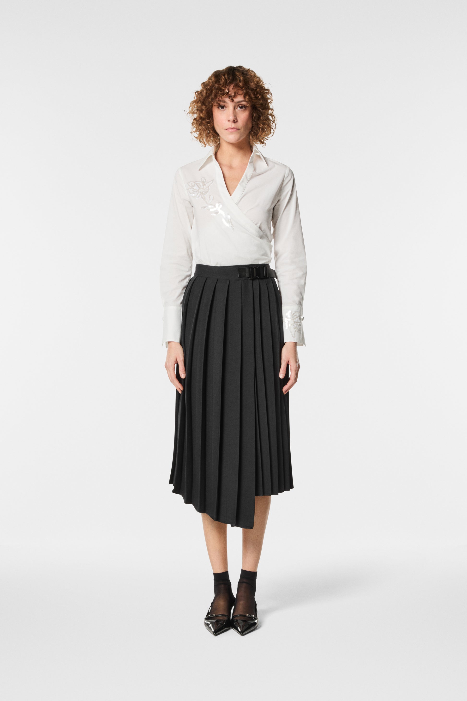 Gonna plissé asimmetrica in twill poly con chiusura a portafoglio. Linea fluida e dinamica, dona movimento e carattere al look. Un capo femminile e versatile, perfetto per outfit eleganti con un tocco moderno e ricercato.