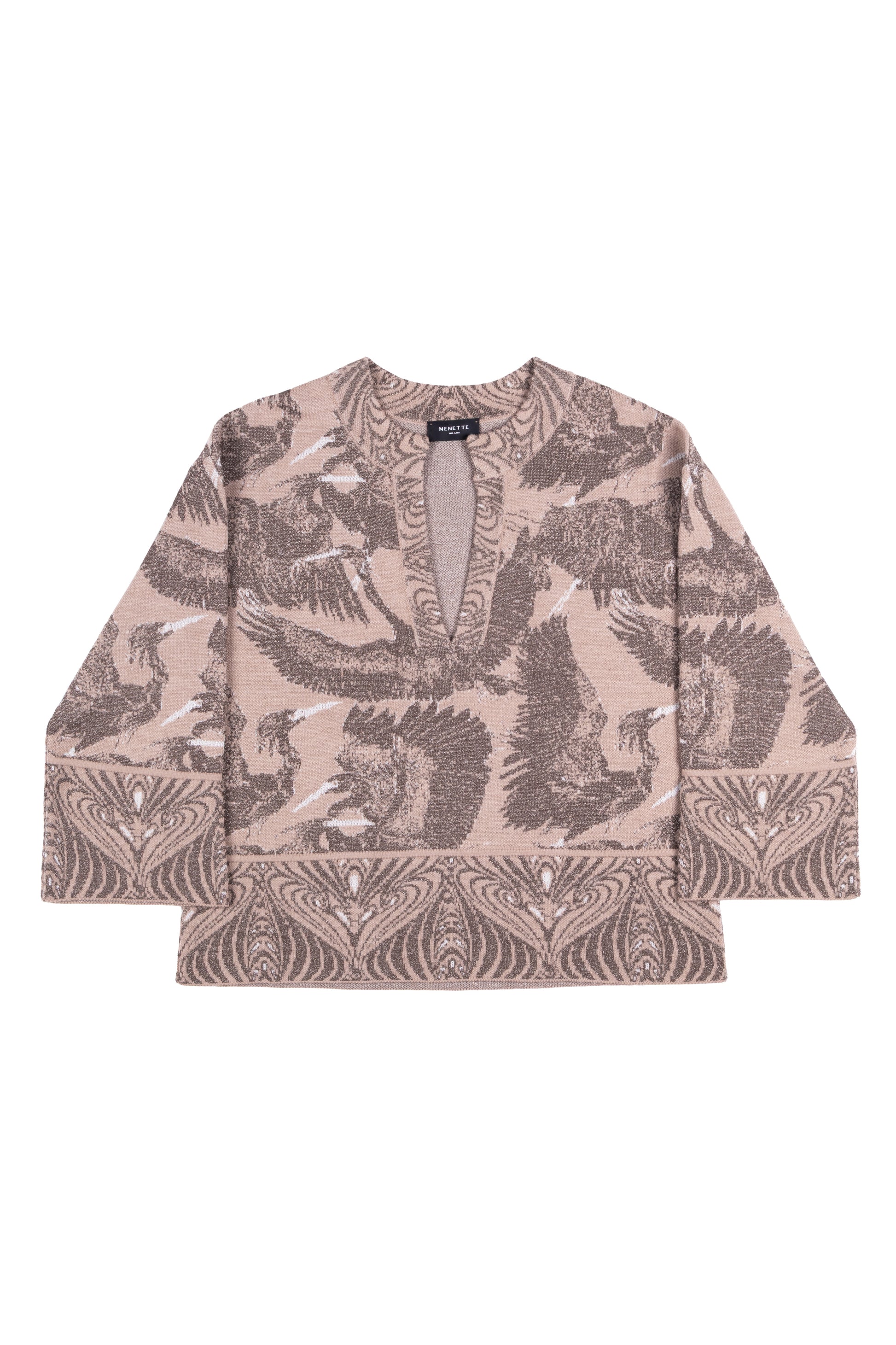 Un capo dal fascino unico, questa maglia in morbido jacquard è valorizzata da un elegante motivo giapponese. Perfetta per un look casual-chic, abbina comfort e stile, rendendo ogni outfit raffinato e originale. Ideale da indossare da sola o con capi leggeri per un’eleganza discreta e contemporanea.