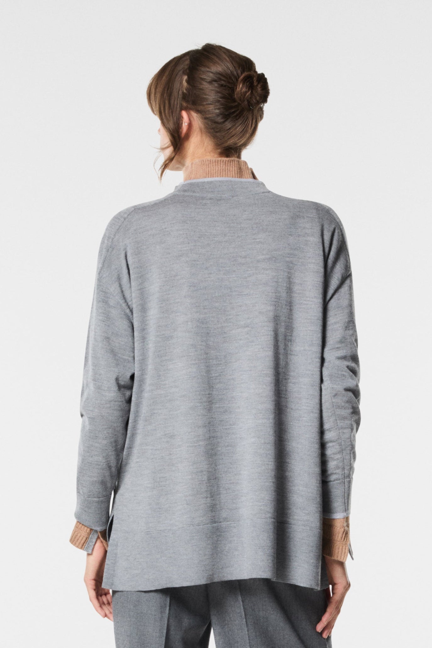 Maglia girocollo in pura lana merino con spacchi laterali, morbida e avvolgente. Un capo versatile e contemporaneo, perfetto per creare look casual-chic con un dettaglio originale che valorizza la silhouette.