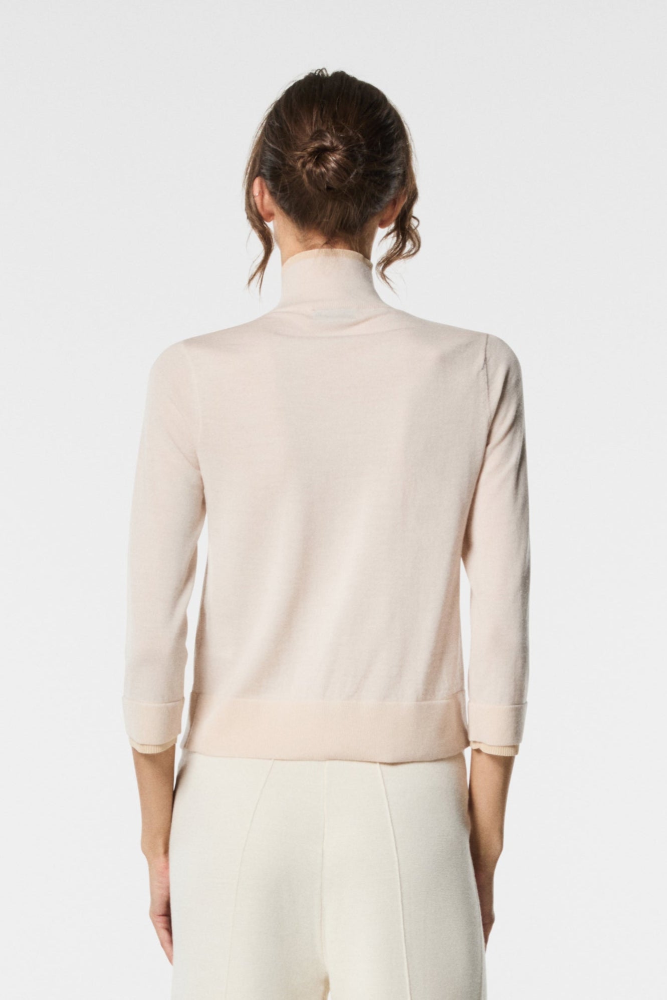 Maglia a collo alto con manica 3/4 in pura lana merino, morbida e traspirante. Un capo elegante e versatile, perfetto per creare look casual-chic o sofisticati senza rinunciare al comfort.