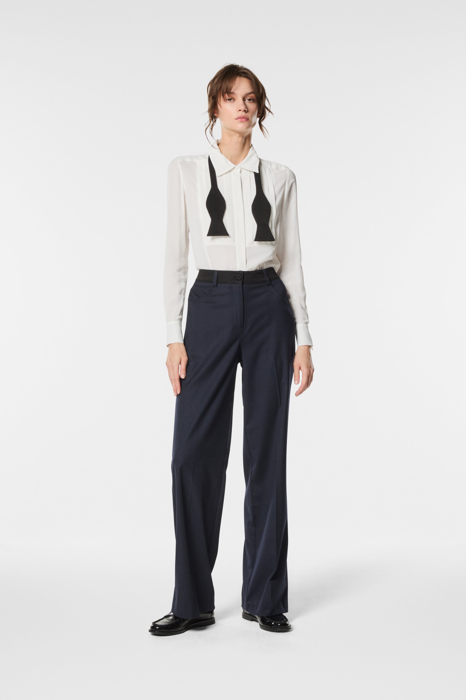 Pantalone a gamba larga in fresco lana stretch con inserti in ottoman, sofisticato e ricercato. La linea ampia incontra dettagli strutturati per un look elegante e contemporaneo. Il tessuto leggero e confortevole lo rende ideale per outfit curati, dal lavoro alle occasioni speciali.
