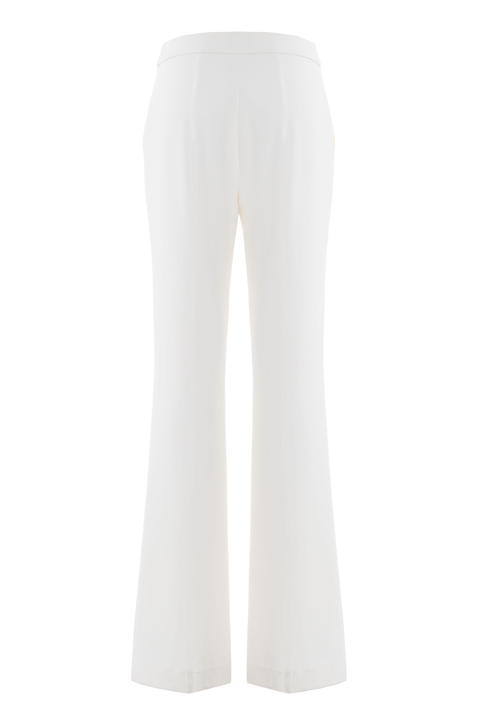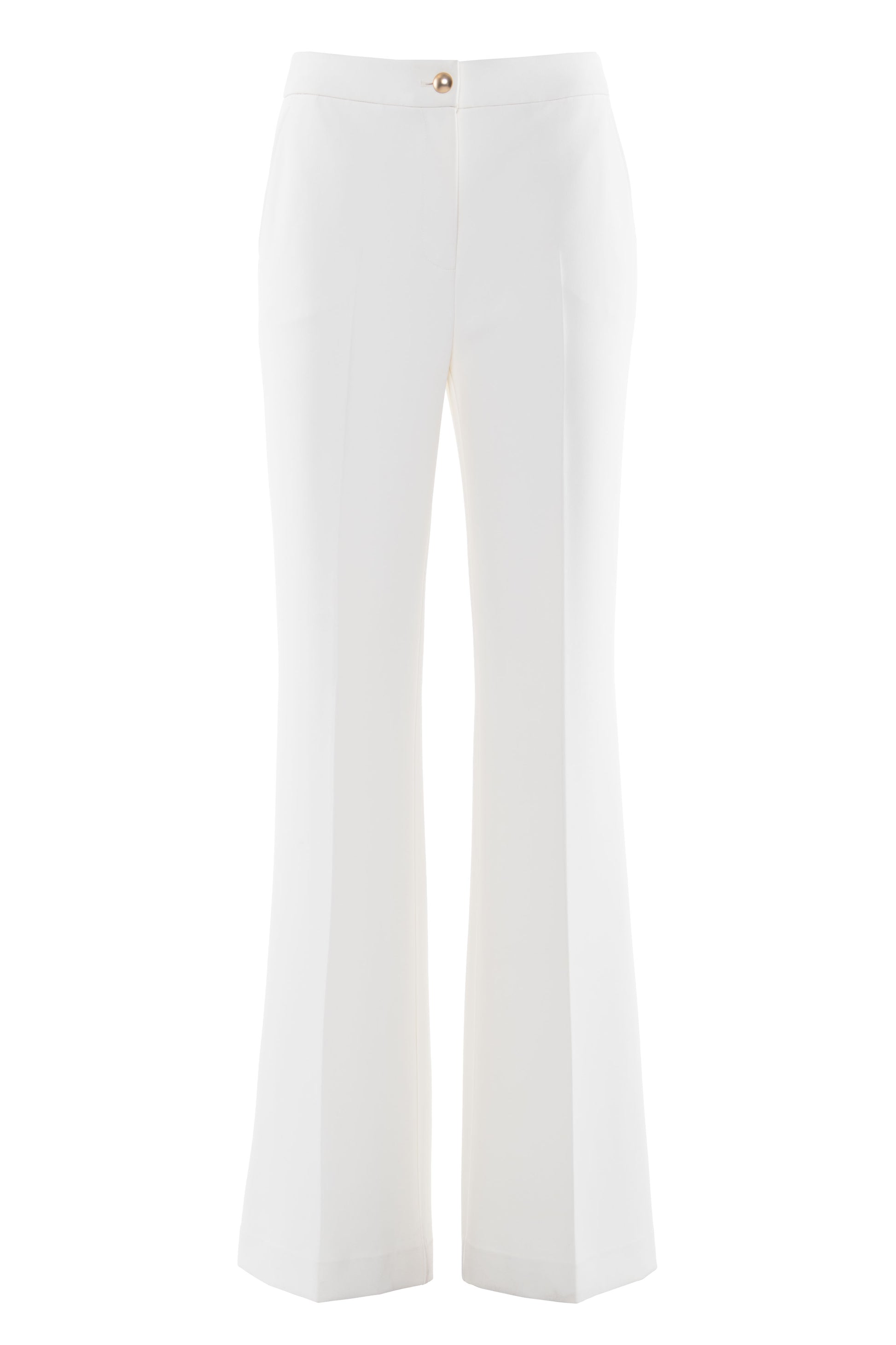 Eleganti pantaloni dal taglio svasato e silhouette fluida valorizzano la figura con un tocco sofisticato. La linea pulita presenta una stiratura centrale impeccabile e un raffinato bottone gioiello dorato in vita. Ideali per creare outfit formali o look da ufficio ricercati, assicurano comfort e una vestibilità sartoriale senza tempo.