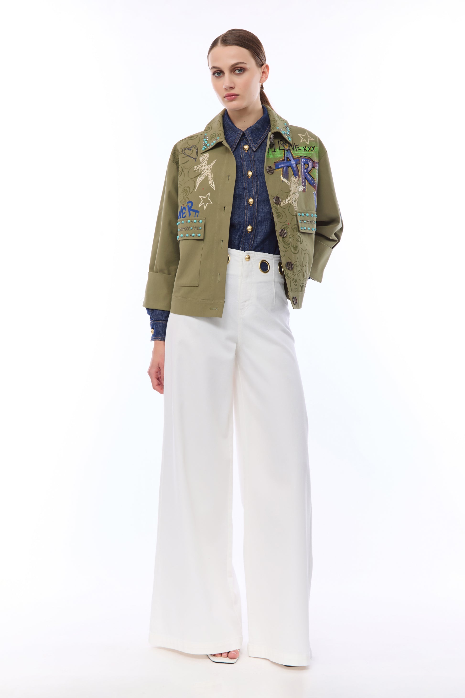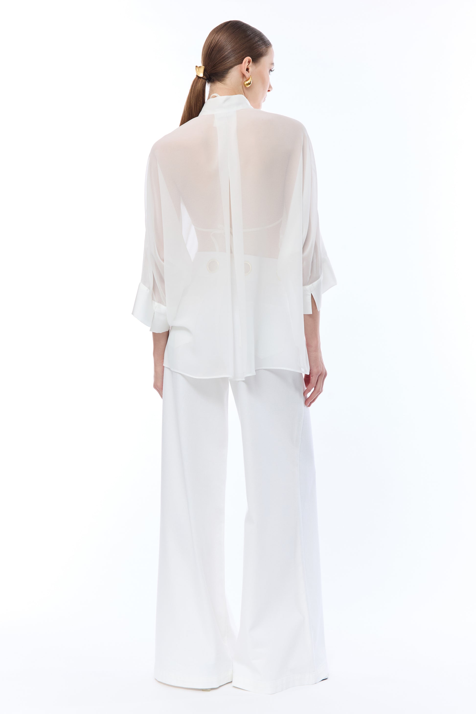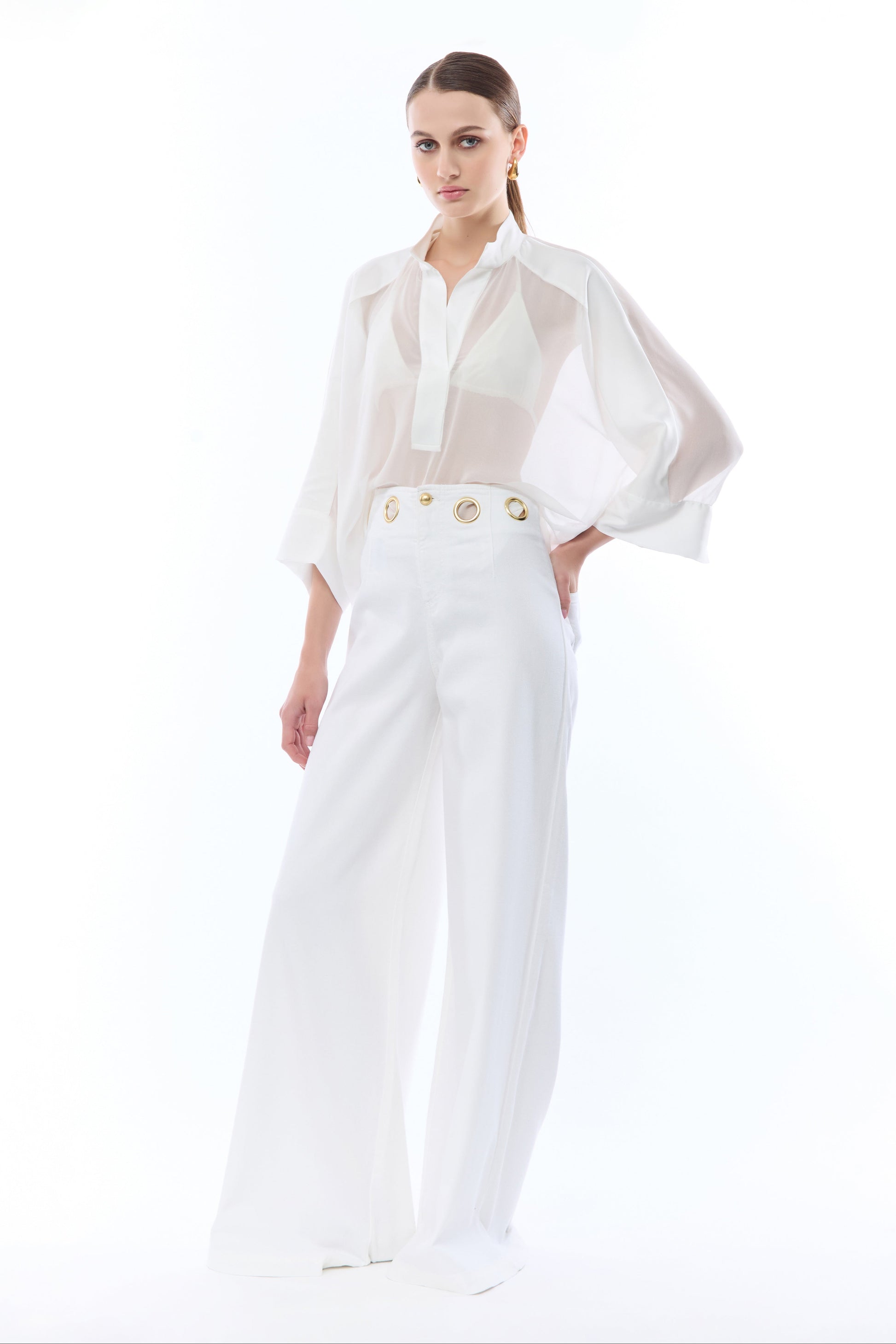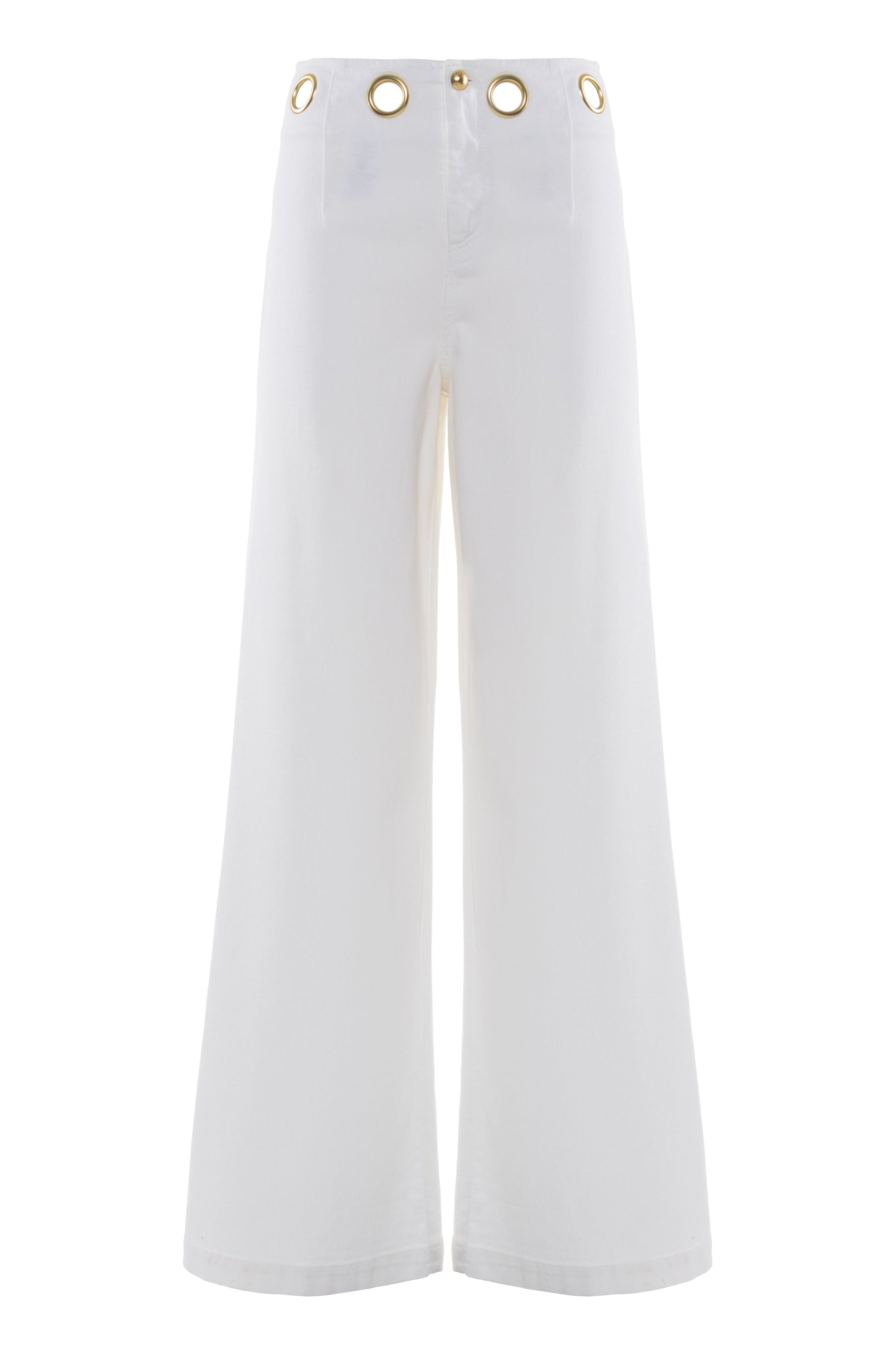 Linee ampie e volumi contemporanei caratterizzano questi pantaloni wide-leg dal taglio fluido. Il girovita è arricchito da occhielli metallici dorati che sostituiscono i classici passanti, aggiungendo un dettaglio luce distintivo. Completano il design le tasche posteriori applicate, di cui una rifinita con logo ricamato in rilievo. Un capo raffinato ideale per outfit sofisticati.