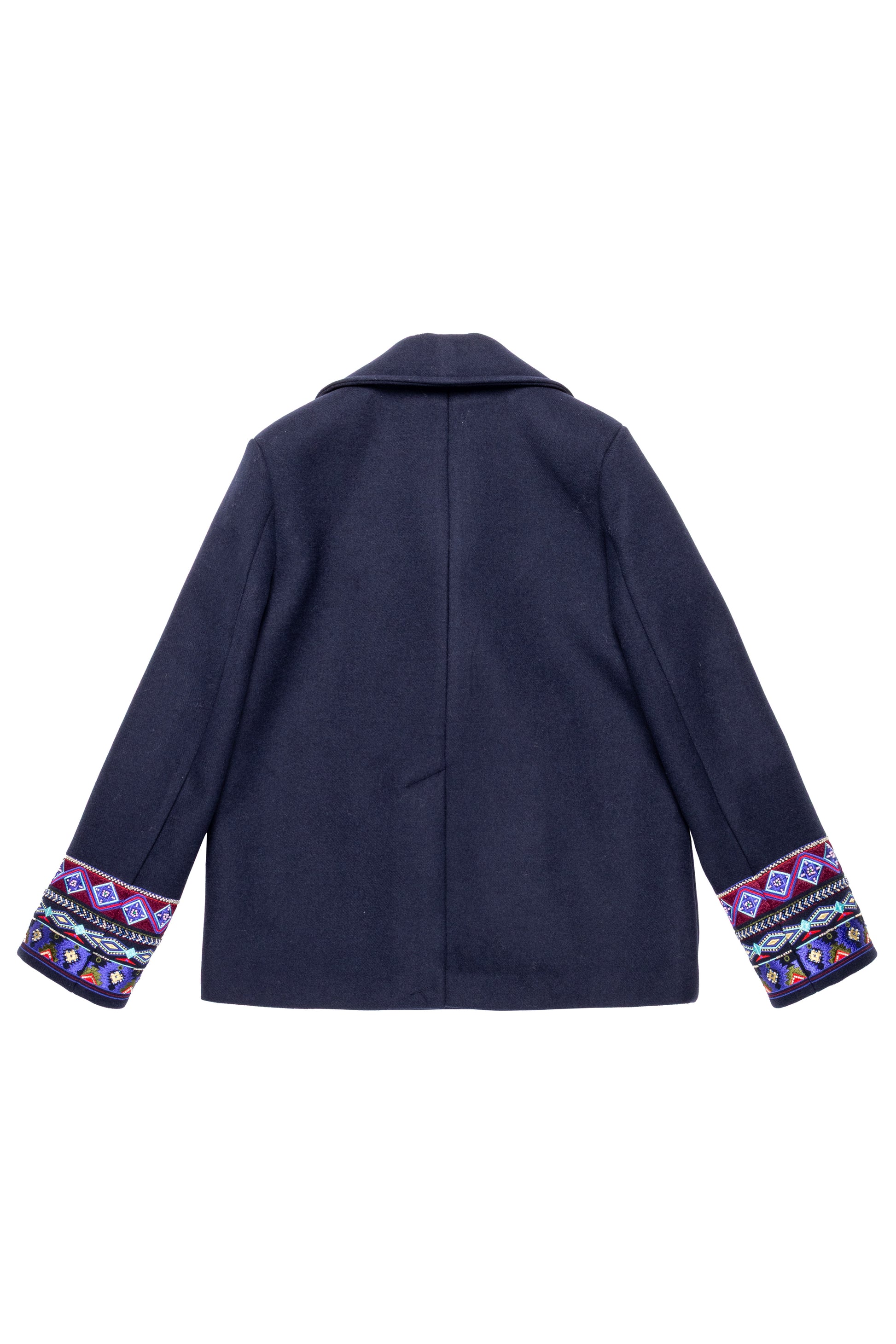 Peacoat in panno di lana con ricamo ai polsi, dettaglio sofisticato che valorizza il design classico. Linee strutturate e doppio petto per uno stile elegante e senza tempo. Caldo e avvolgente, perfetto per look urbani e casual-chic nelle giornate più fredde.