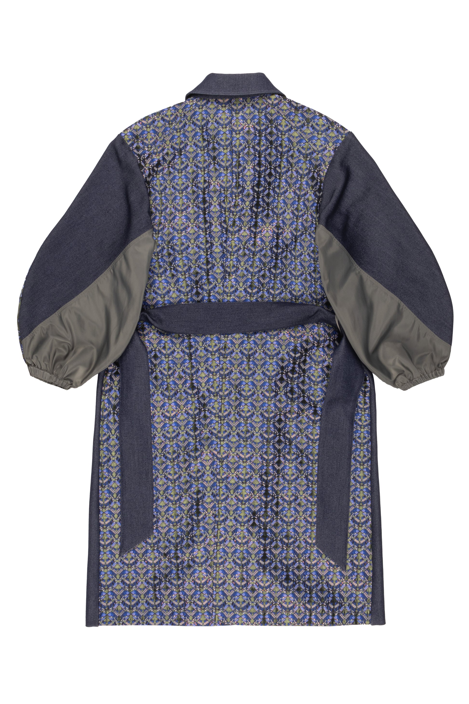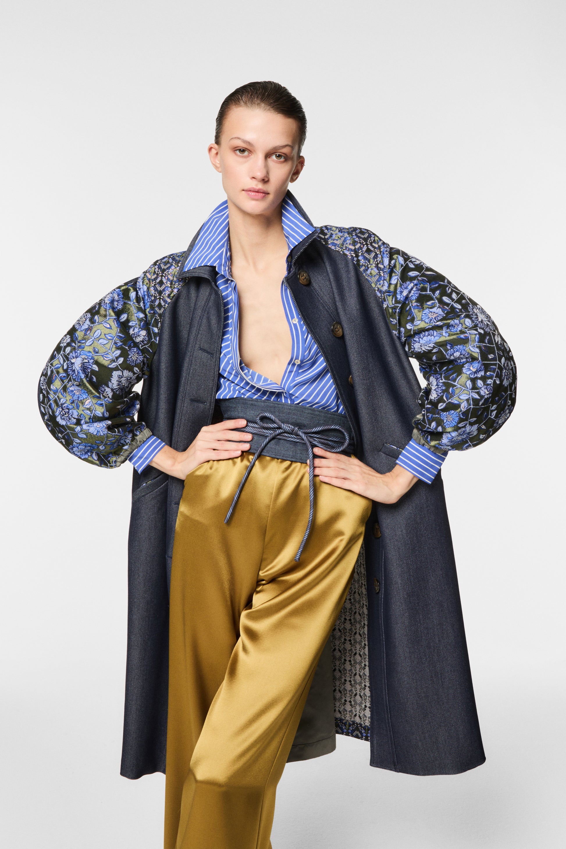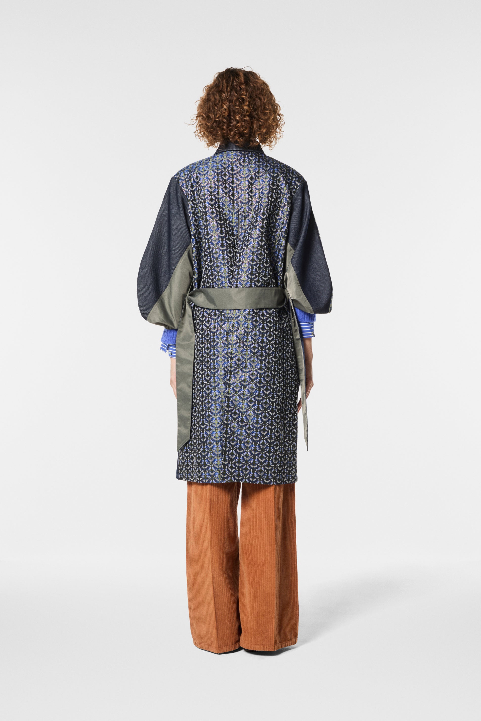 Trench lungo in twill effetto denim patchwork, maniche e schiena impreziosite da un jacquard ricamato. Eleganza e originalità si uniscono in un capo versatile e sofisticato. Linea fluida e dettagli preziosi per un look dal forte impatto stilistico.