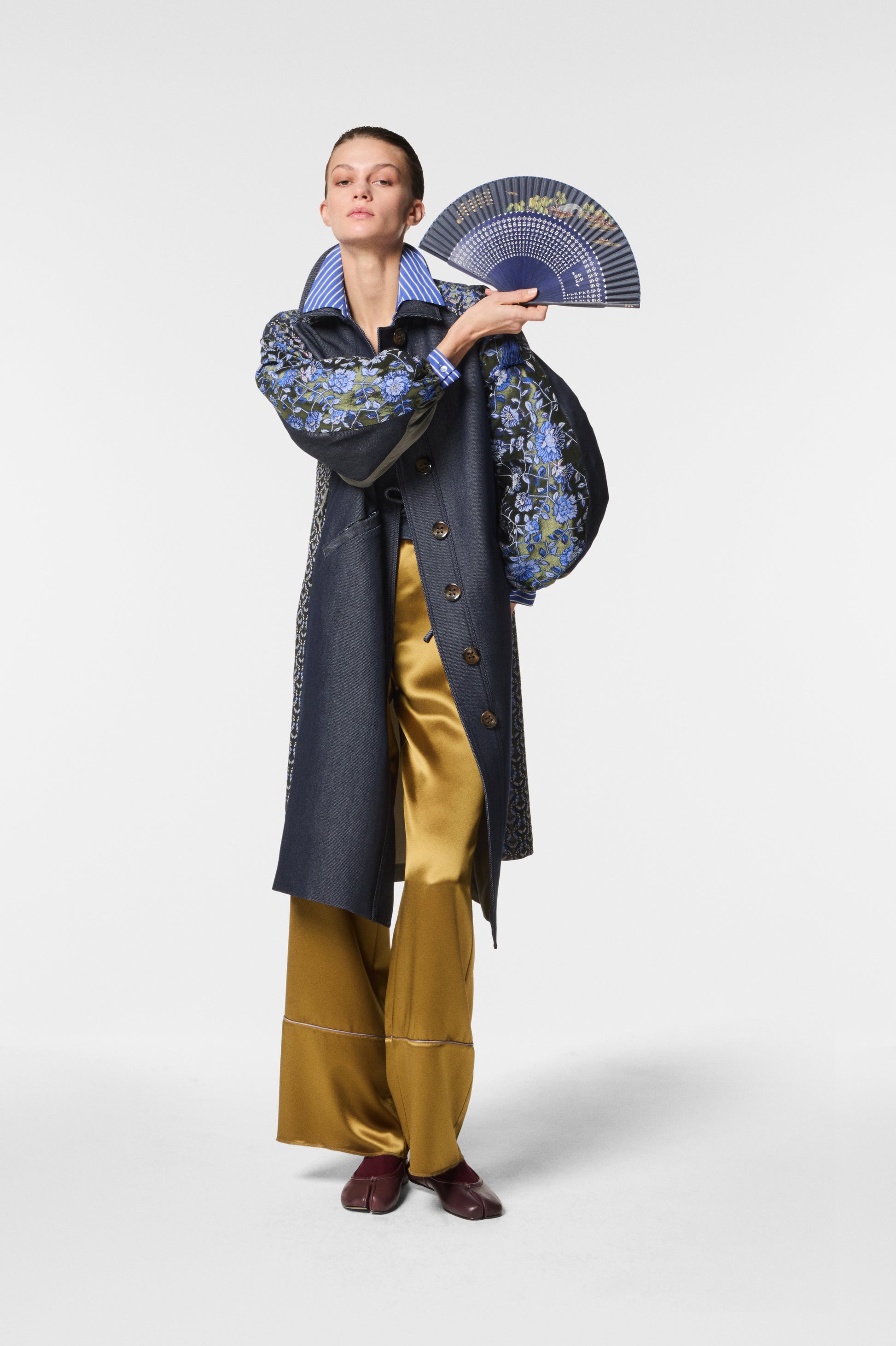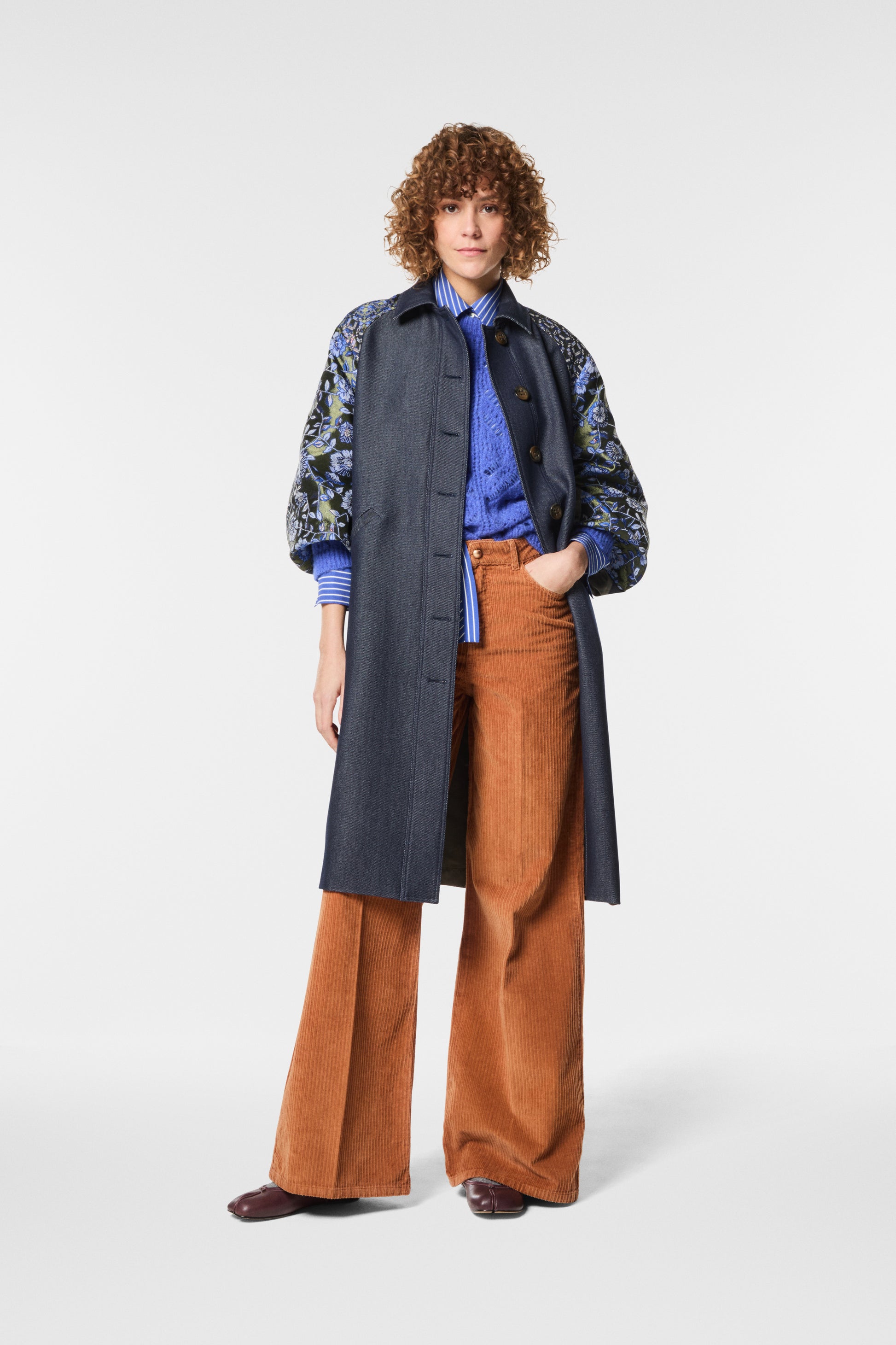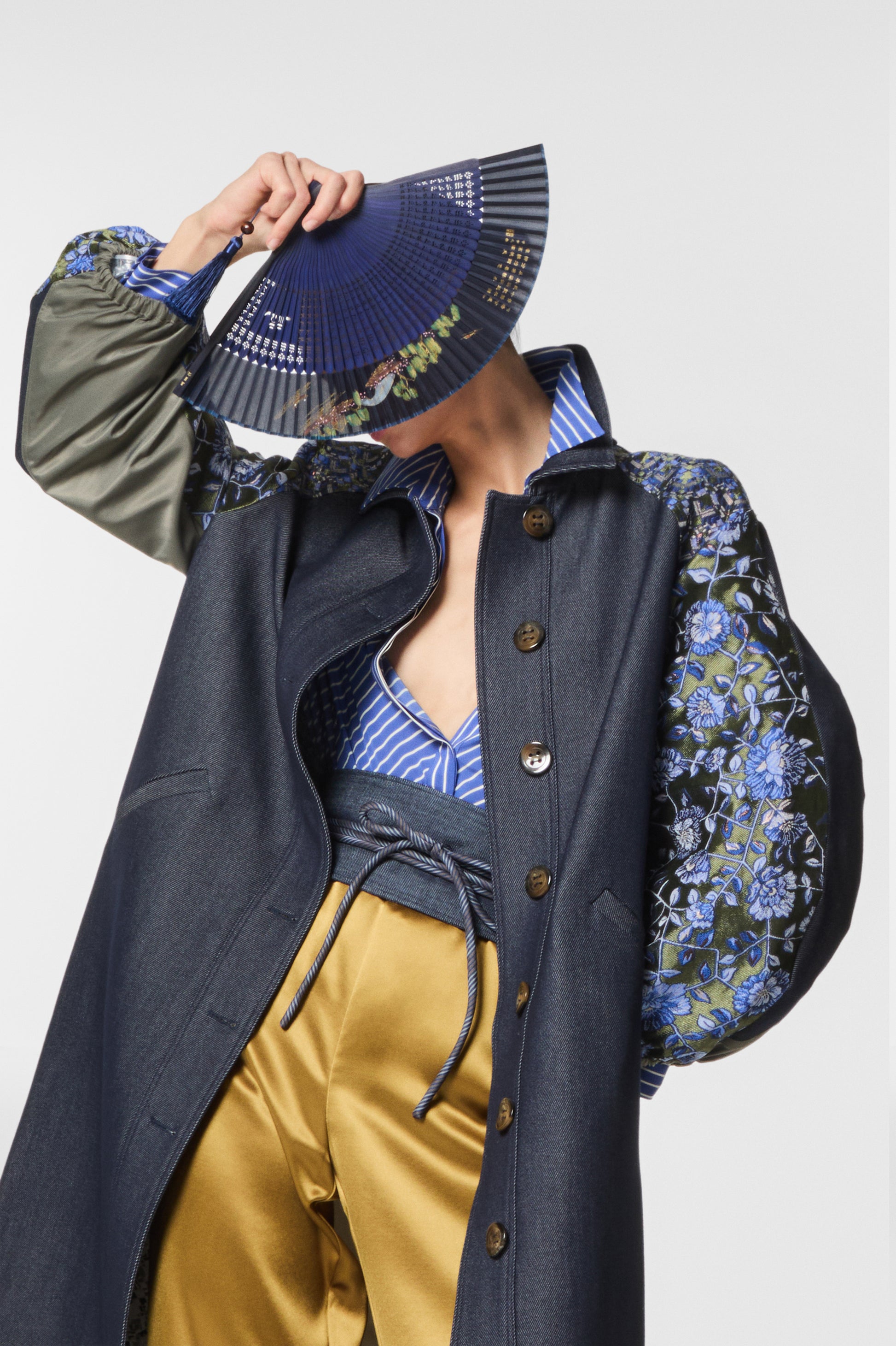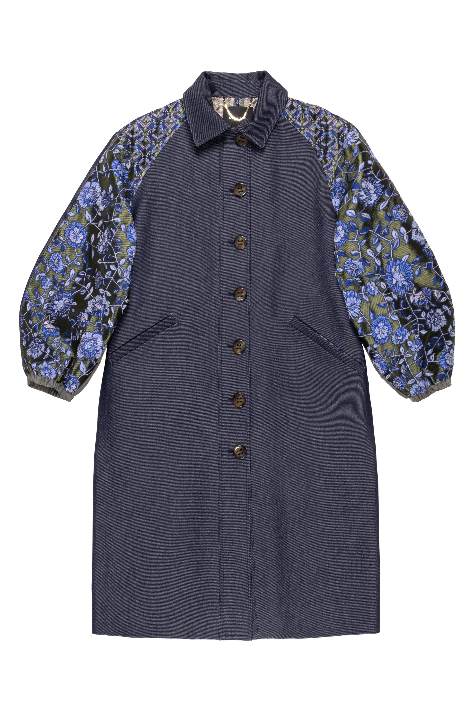 Trench lungo in twill effetto denim patchwork, maniche e schiena impreziosite da un jacquard ricamato. Eleganza e originalità si uniscono in un capo versatile e sofisticato. Linea fluida e dettagli preziosi per un look dal forte impatto stilistico.