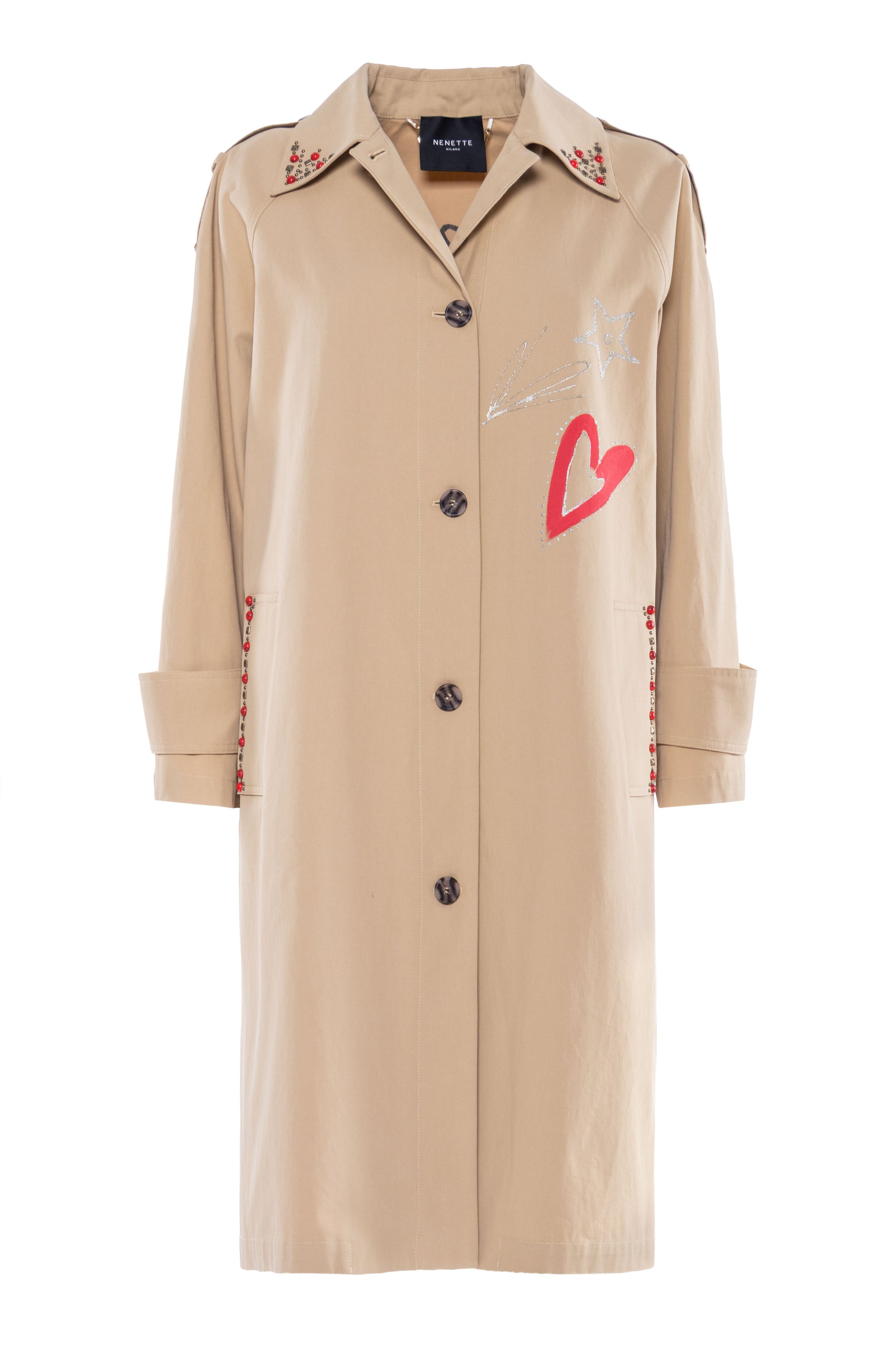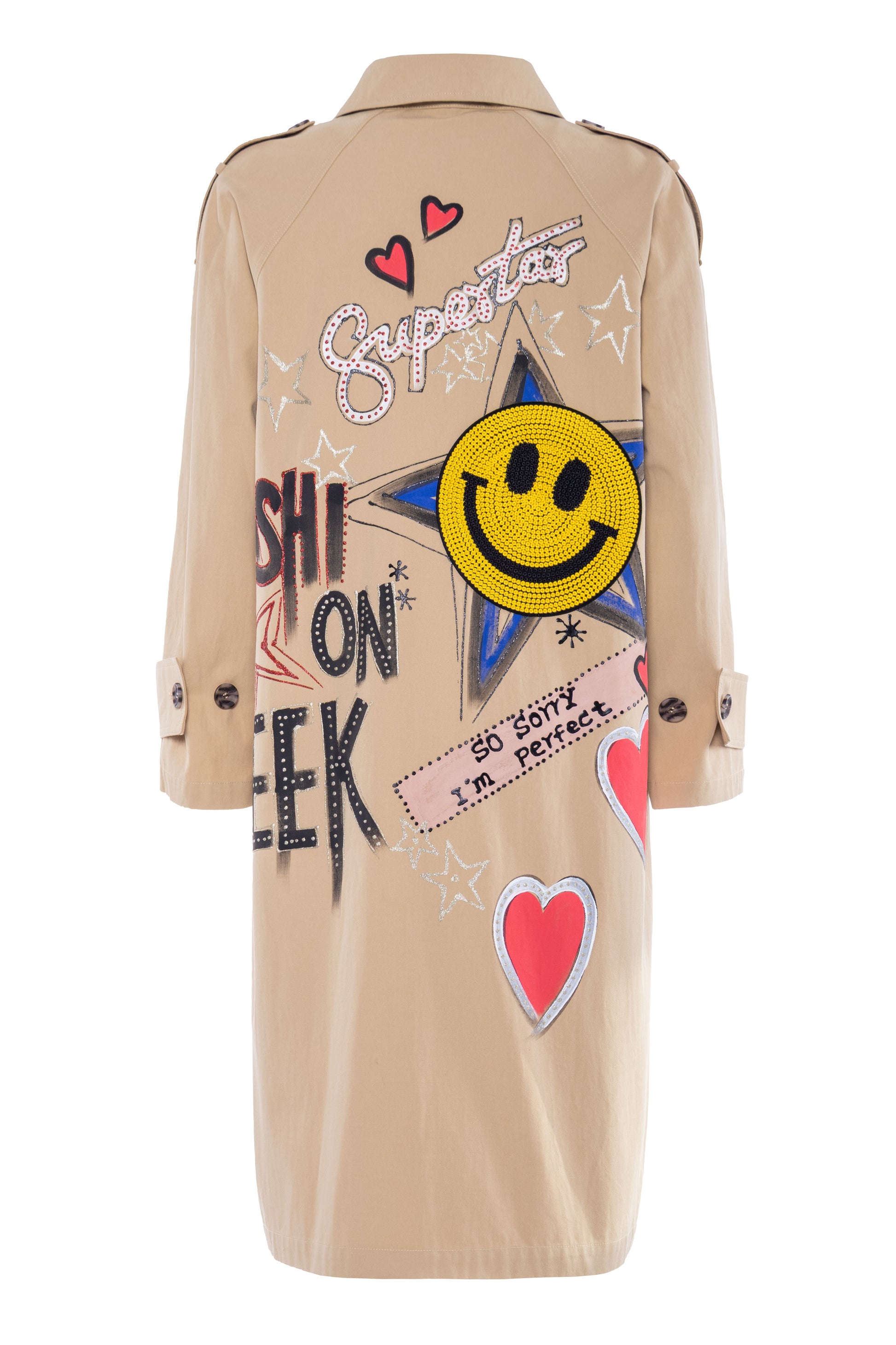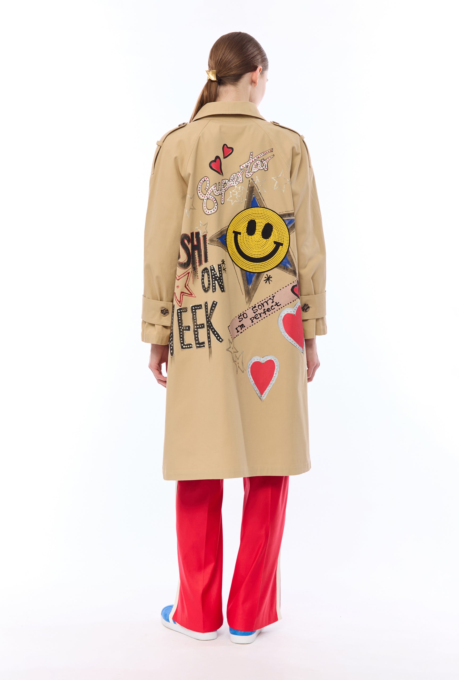 Linee classiche e spirito ribelle si fondono in un trench dal design audace e creativo. Il modello presenta revers decorati con borchie, mostrine sulle spalle e una chiusura monopetto con bottoni scuri. Grafiche pop, scritte graffiti e uno scenografico smile di paillettes sul retro trasformano un capo iconico in un manifesto di stile contemporaneo e giocoso.
